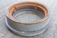 Dieser Ring, der wie eine riesige Unterlegscheibe aussieht, wird auf dem Konus nach alter Bauart im Mörtelbett verlegt. Darauf können Ausgleichsringe nach neuer Bauart mit Verschiebesicherung montiert werden. Ein Vorteil, denn Ausgleichsringe nach alter Bauart sind nicht güteüberwacht. Der Rahmen der Abdeckung kann aber auch direkt auf den Adapterring gesetzt werden. Der gusseiserne Ring hat an der Innenseite einen nach oben und unten ragenden Kragen, der eine horizontale Verschiebung der angrenzenden Bauteile gegeneinander verhindern soll.