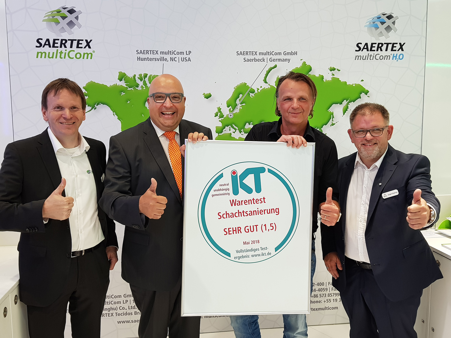 Swietelsky-Faber hat mit seinem SF-Schachtliner im Nachtest zum IKT-Warentest „Schachtsanierung“ mit der Note „Sehr gut (1,5)“ abgeschnitten. Roland W. Waniek, Geschäftsführer des IKT - Institut für Unterirdische Infrastruktur, überreichte auf der IFAT 2018 das IKT-Warentest-Siegel an Jörg Brunecker, Geschäftsführer von Swietelsky-Faber. SAERTEX multiCom, an deren Messestand die Übergabe stattfand, hatte den Liner zugeliefert.