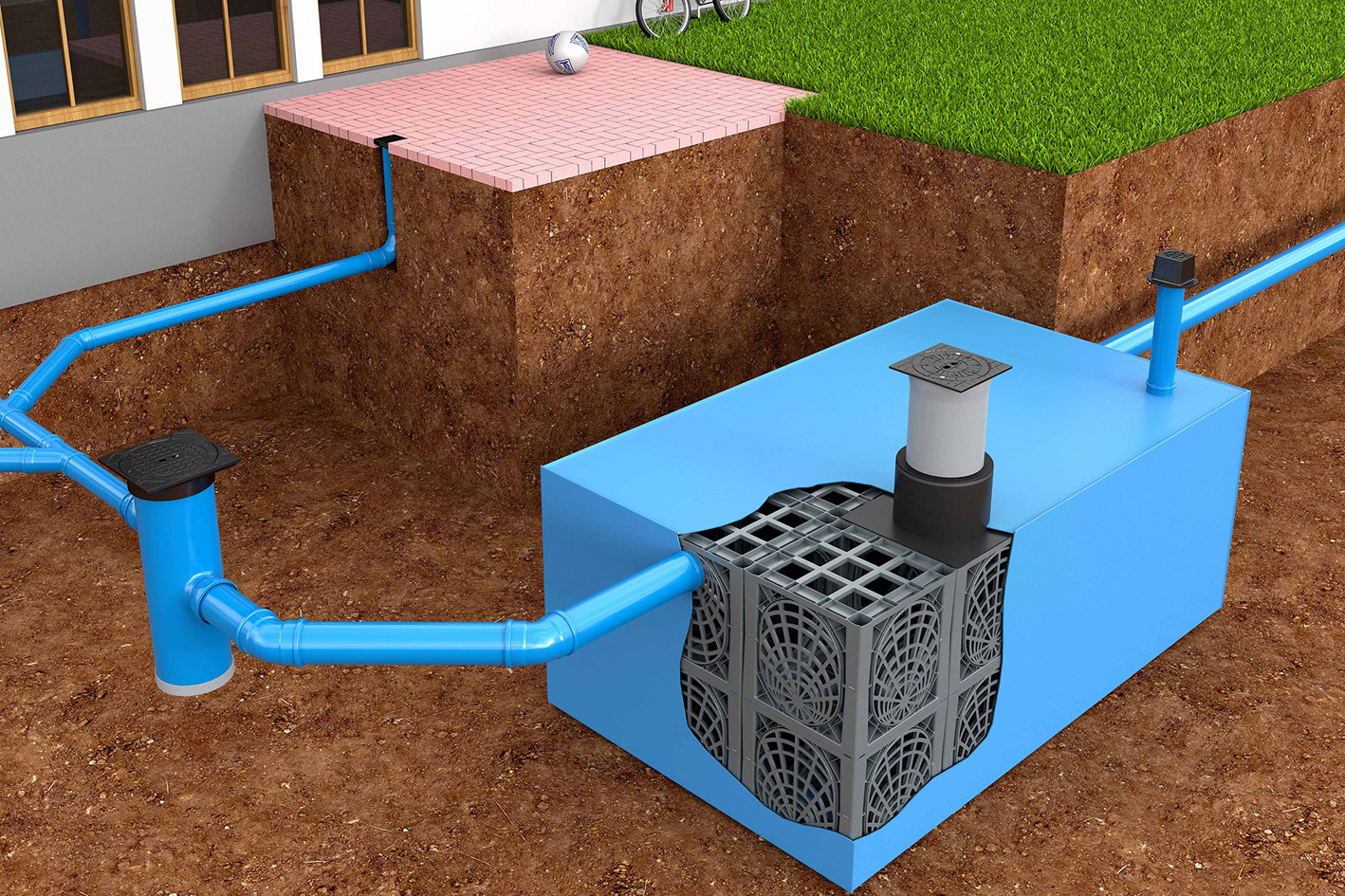 Während es sich beim D-Raintank 3000® um einen unterirdischen Speicher handelt, in dem Regenwasser gesammelt und anschließend nach und nach in den Untergrund entlassen wird, eignet sich die KS-Bluebox® nicht nur für die Rückhaltung von Regenwasser, sondern – mit Blick auf eine spätere Entnahme und Nutzung – auch für eine dauerhafte Speicherung.