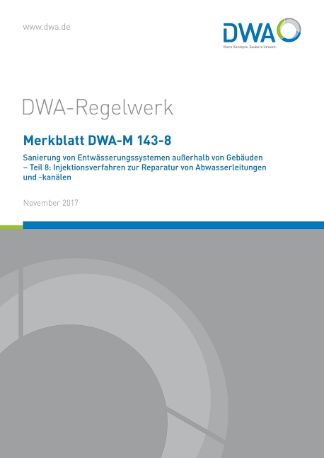 Die Deutsche Vereinigung für Wasserwirtschaft, Abwasser und Abfall e. V. (DWA) hat das Merkblatt DWA-M 143-8 „Sanierung von Entwässerungssystemen außerhalb von Gebäuden – Teil 8: Injektionsverfahren zur Reparatur von Abwasserleitungen und -kanälen“ veröffentlicht.