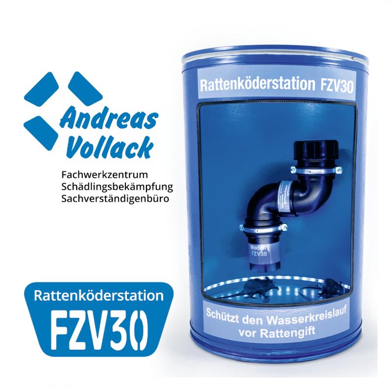 Auch Andreas Vollack, Inhaber und Geschäftsführer des Unternehmens Andreas Vollack Fachwerkzentrum und Schädlingsbekämpfung hat sich dieses Problems angenommen und die Rattenköderstation FZV30 entwickelt. Er nutz das Tauchglocken oder Senkkastenprinzip für seine Rattenköderstation. Seine FZV30 Rattenköderstation wird fest im Kanal oder Revisionsschacht installiert.