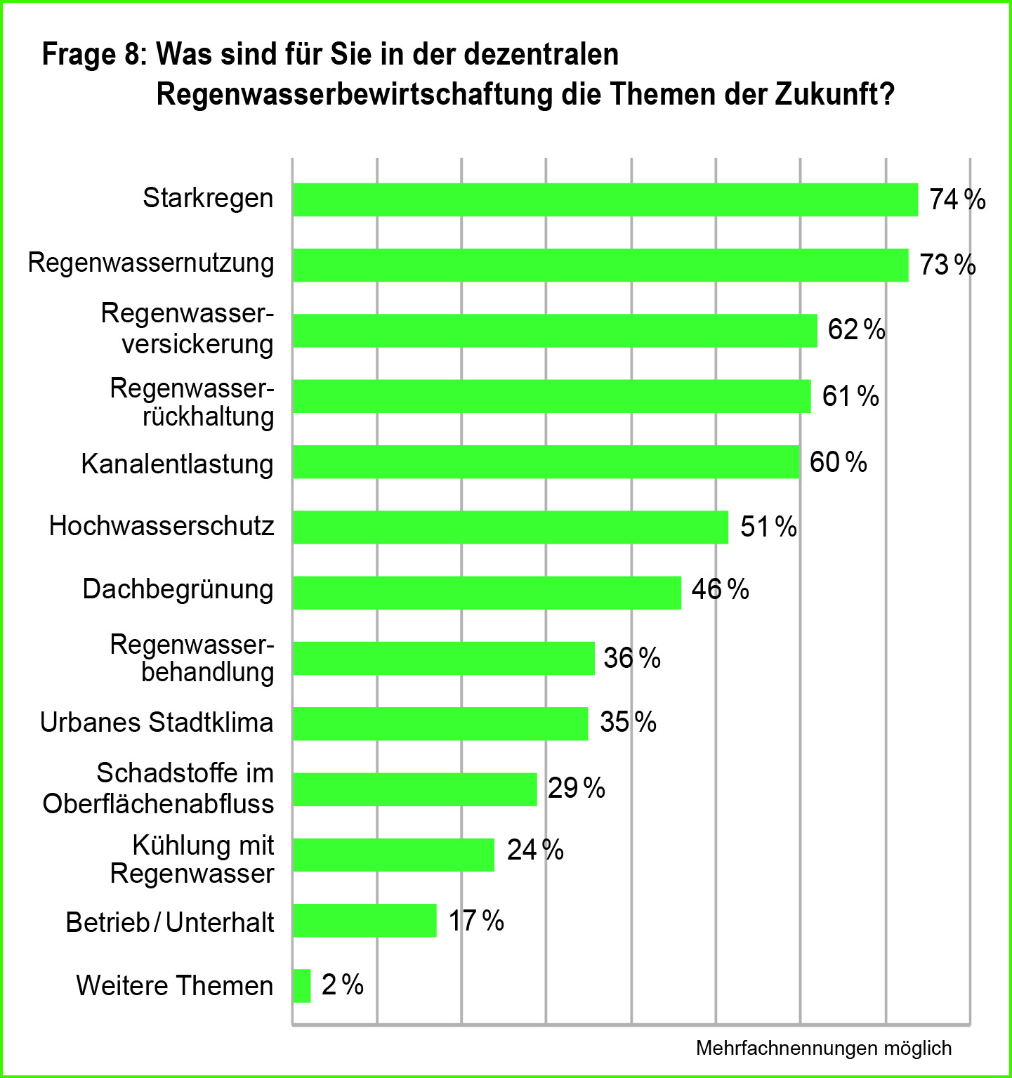 So ist es auch der Ausgleich zwischen Wasserüberschuss und Wassermangel, der von 69 % der Befragten als größte Chance bei den Maßnahmen der Regenwasserbewirtschaftung angesehen wird. Im Vergleich zu einer von Mall 2015 durchgeführten Umfrage bei Planungsbüros haben dabei die Bereiche Versickerung, Rückhaltung und Nutzung mit jeweils plus 5-10 % deutlich an Bedeutung gewonnen.
