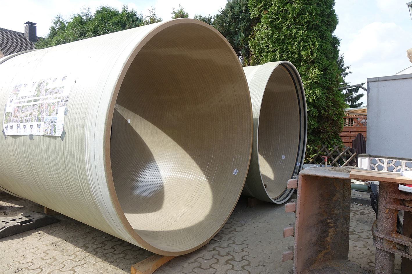 Zusätzlich zu den GFK-Rohren DN 2300 mit jeweils einer Länge von drei Metern liefert Amiblu auch den Zulauf- und den Drosselschacht sowie weitere drei Schächte für den Stauraumkanal.