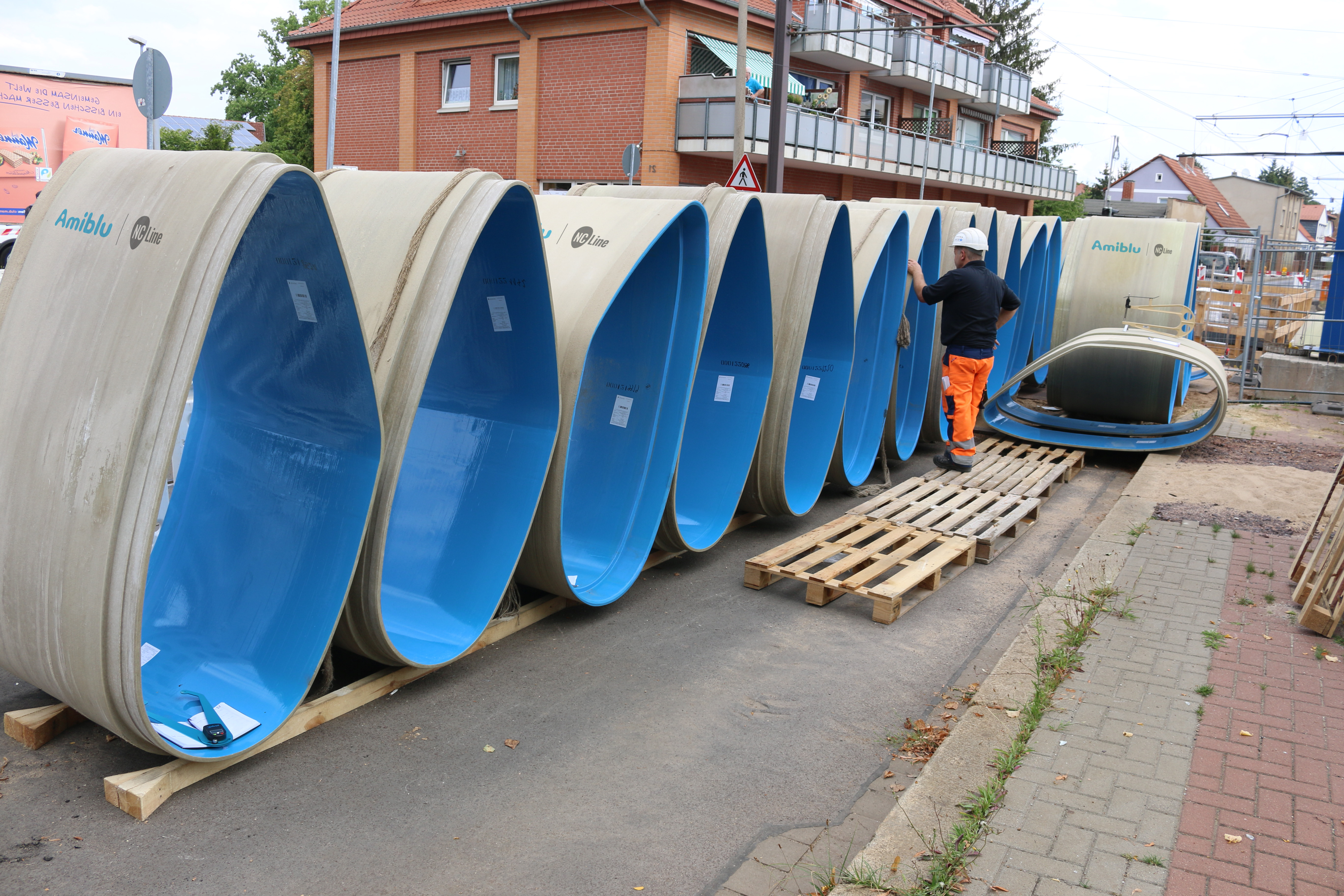 Auch in Sachen Nachhaltigkeit übernimmt Amiblu Verantwortung: Die Herstellung der GFK-Rohre erfolgt mit einem deutlich geringeren Energieeinsatz im Vergleich zu konventionellen Materialien wie Beton oder Stahl. Durch das geringe Gewicht der Rohre werden Transport- und Einbauaufwand reduziert, wodurch CO₂-Emissionen auf der Baustelle erheblich verringert werden. Hinzu kommt: Die lange Lebensdauer spart häufige Sanierungen oder Erneuerungen und trägt so zur Entlastung kommunaler Haushalte und zur Schonung natürlicher Ressourcen bei.