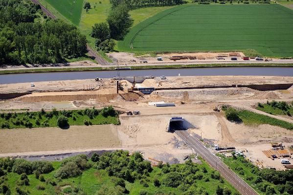 In Elbeu (Landkreis Börde) kreuzt der Mittellandkanal die Bahnlinie Magdeburg –Stendal. Die Eisenbahn fährt bereits seit 1928 in einem Tunnel unter dem Kanal hindurch. In einem Großbauprojekt wird nun der 100m lange Eisenbahntunnel abgerissen und durch ein 164 m langes Bauwerk aus Stahlbeton ersetzt. Gleichzeitig wird der Mittellandkanal darüber auf einer Länge von 3,3 km so ausgebaut, dass künftig zwei Binnenschiffe nebeneinander Platz haben.