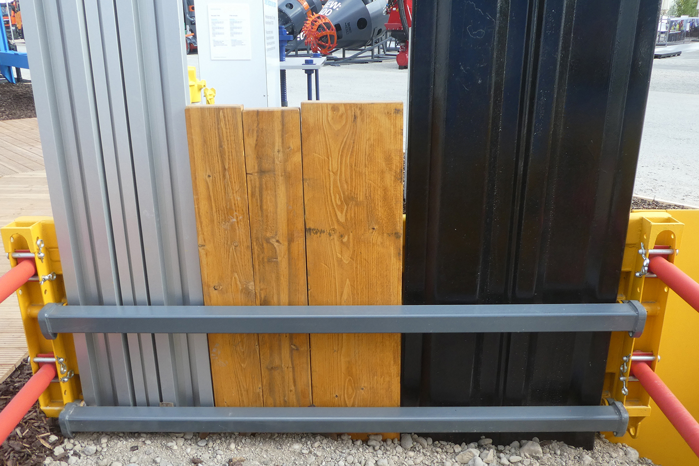 Das so vorbereitete Rahmenverbauelement wird in den ausgehobenen Graben eingehoben und positioniert. Falls erforderlich wird die Verbauplatte durch Drehen der Verbaustreben an die Grabenwand gedrückt. Der Leerraum zwischen der Grabenwand und dem eingebauten Verbauelement ist auf der ganzen Höhe kraftschlüssig zu verfüllen. „Danach können Holzbohlen, Stahl- oder Alu-Dielen senkrecht eingestellt werden, wobei die ausklappbaren Rahmenbalken dabei als Führung dienen“, so Eberhard Uelner weiter.