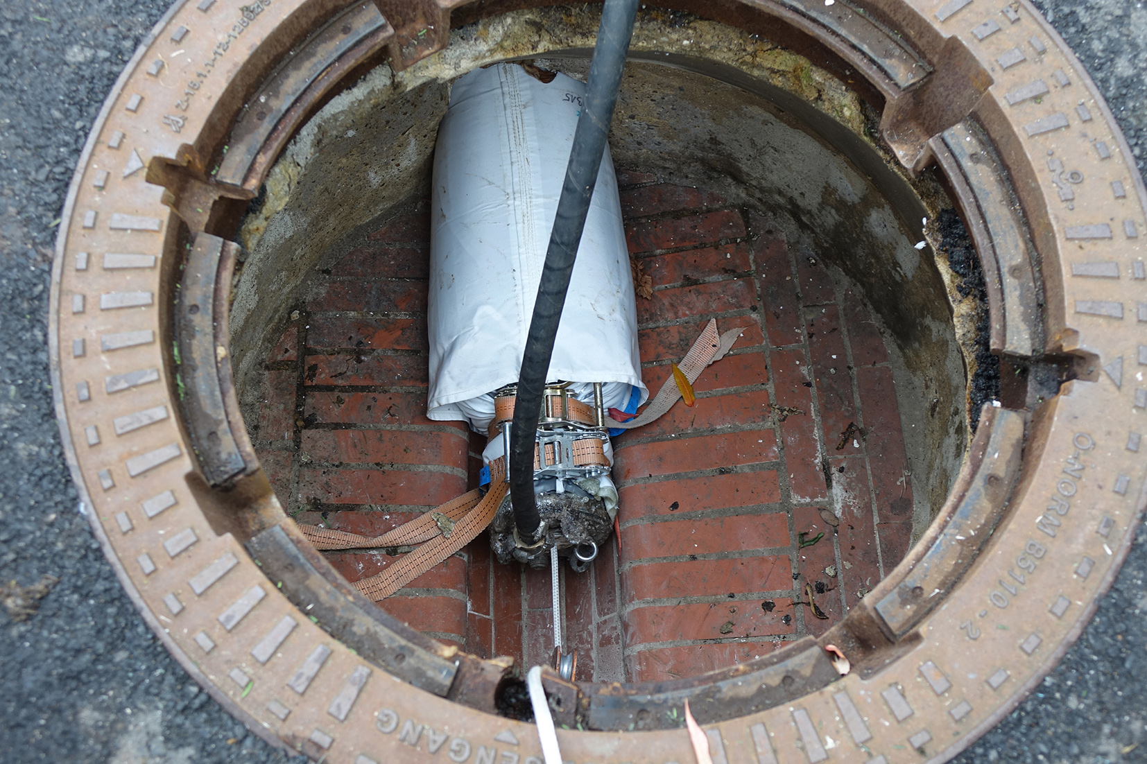 Vor Beginn der Sanierungsarbeiten wurden die vorhanden Seitenzuläufe für die spätere Wiedereinbindung eingemessen und die Haltung gereinigt. Für den Einzug wurde der Liner mit einer Seilwinde verbunden und langsam über einen Schacht in die Haltung eingezogen. Am Zielschacht angekommen, brachte das Team der D&S Rohrsanierung den für die UV-Lichthärtung benötigten Lampenzug in den noch nicht aufgestellten Liner ein.