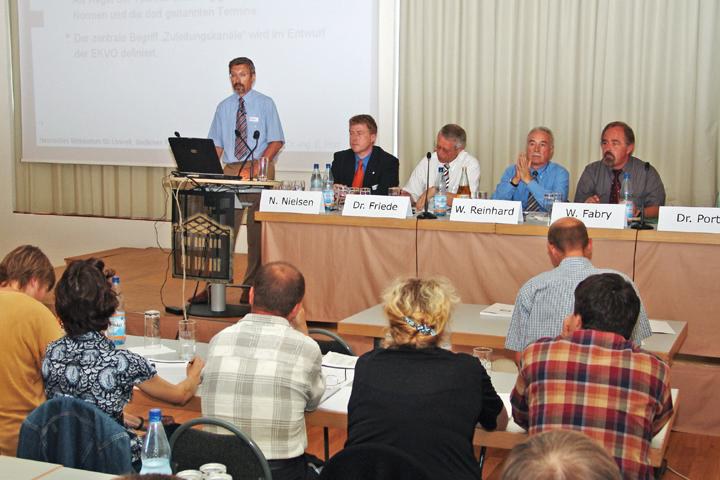Dipl.-Ing. Walter Reinhard, Dezernent im Regierungspräsidium Darmstadt, Abteilung Umwelt Darmstadt, hatte die Aufgabe übernommen, den Entwurf der vierten Verordnung zur Änderung der Abwassereigenkontrollverordnung vorzustellen. "Walter Reinhard ist Obmann der Arbeitsgruppe EKVO, die federführend an der Gestaltung der Verordnungen arbeitet", erklärt Dipl.-Ing. Norbert Nielsen, einer der vom Güteausschuss der Gütegemeinschaft Kanalbau beauftragten Prüfingenieure mit Büro in Reinheim/Odenwald. Nielsen, der für die Organisation der Informationsveranstaltung verantwortlich zeichnete, ist von der Aktualität und Dringlichkeit des Themas überzeugt und sieht sich durch die hohe Beteiligung bestätigt. Nielsen: "In vielen Einzelgesprächen konnte ich mich davon überzeugen, wo Auftraggebern, Planern, privaten Netzbetreibern und ausführenden Unternehmen bei der Umsetzung von HWG und EKVO der Schuh drückt."