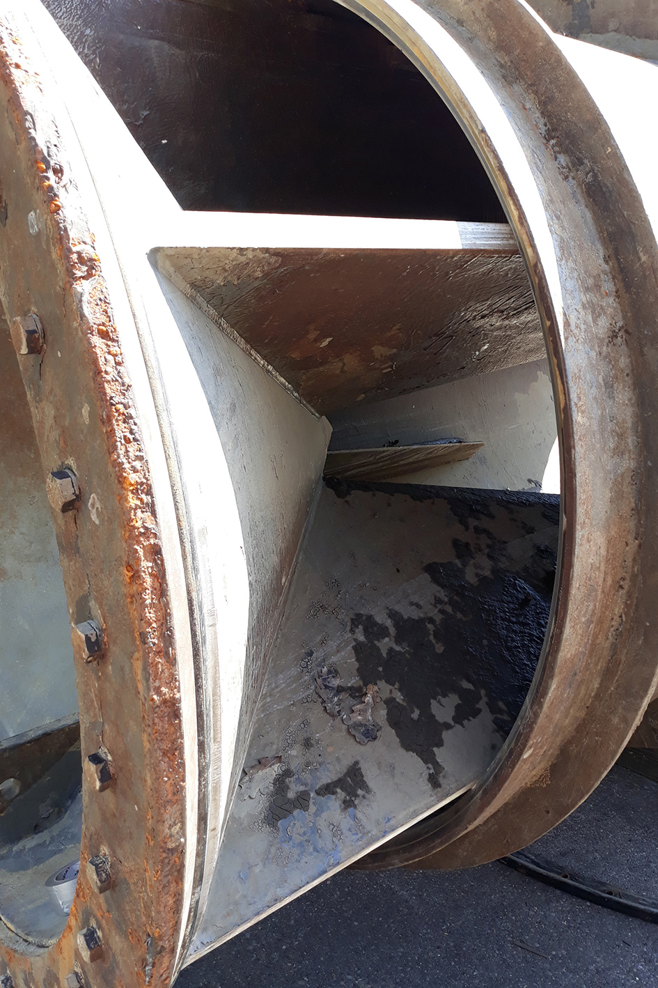 Auch die Absperrklappe und das Zwischenrohr wiesen Schäden auf, die ebenfalls instandgesetzt werden mussten. Zudem sollte das Zwischenrohr eingekürzt und mit einem neu herzustellenden Ausbaustück ergänzt werden. Dieses neue Ausbaustück soll zukünftig eine einfachere Zugänglichkeit und Wartung des Rohrstrangs möglich machen. Da für die Beseitigung der vorliegenden Schäden der Kegelstrahlschieber in seine Einzelteile zerlegt werden musste und auch das Einkürzen des Zwischenrohres nicht vor Ort erfolgen konnte, wurden beide Bauteile aus der Anlage ausgebaut, extern aufgearbeitet beziehungsweise bearbeitet und anschließend wieder eingebaut.