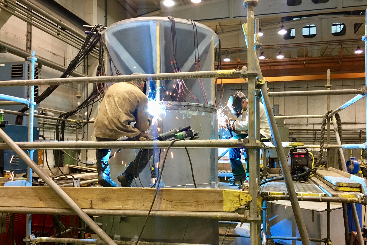 Für die fachgerechte Instandsetzung des Kegelstrahlschiebers musste dieser zunächst in seine Einzelteile zerlegt werden. Mithilfe eines Hallenkrans wurde er vertikal aufgerichtet und anschließend das Schieberrohr aus der Schieberhülse herausgehoben. Bevor sie die Kavitationsschäden durch mehrlagige Auftragsschweißungen beseitigten, brachten die geschulten Mitarbeiter von RAC Glühgürtel an dem Schieberrohr an.