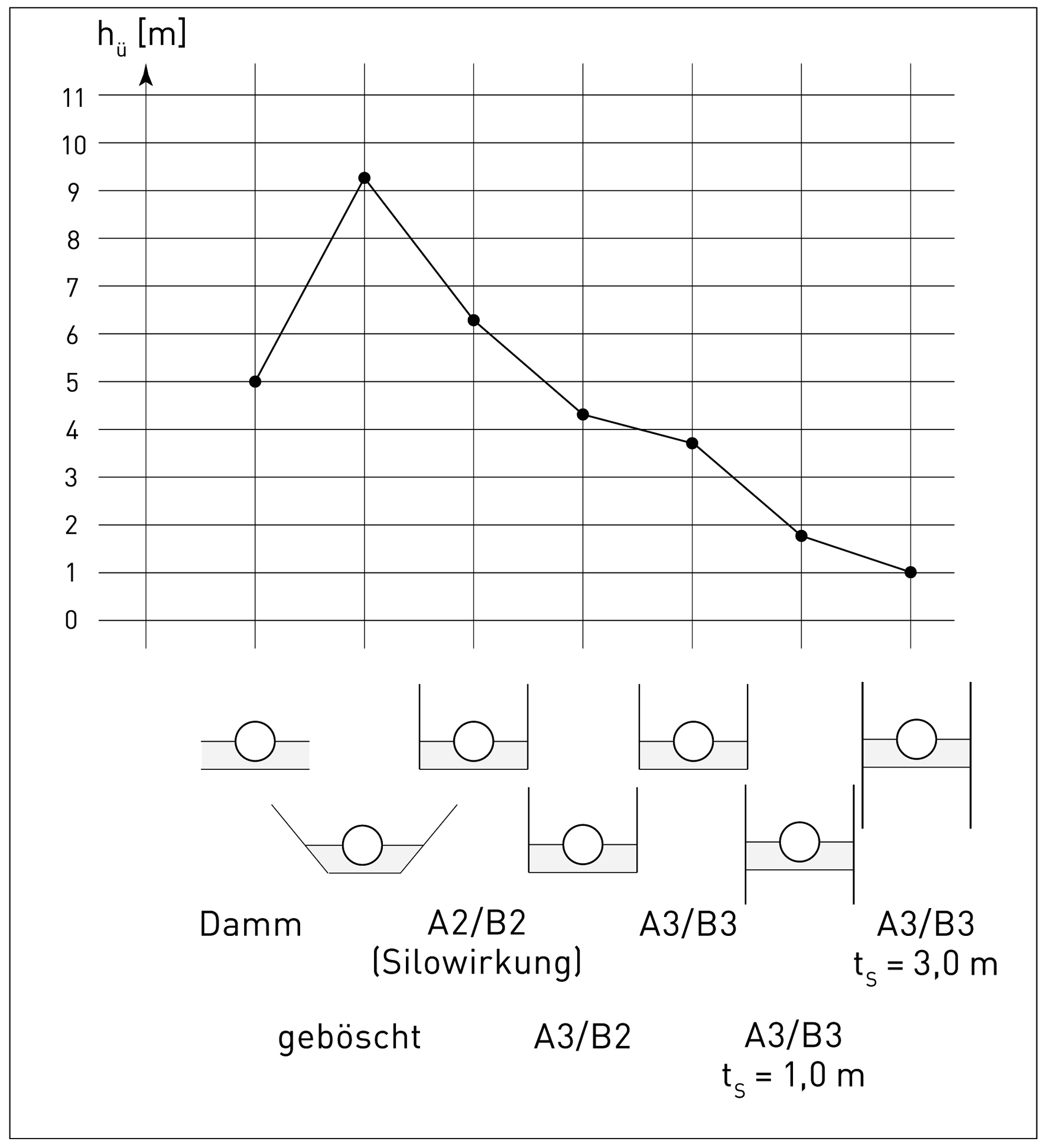 Durch Vorgabe der Einbettungs- und Überschüttungsbedingungen wird in der Statik z. B. der Einfluss der Grabensicherung auf die Belastung der Rohre berücksichtigt. Zur Veranschaulichung des Einflusses ist in Abbildung 2 die mögliche Überdeckungshöhe in Abhängigkeit von der gewählten Grabensicherung dargestellt.