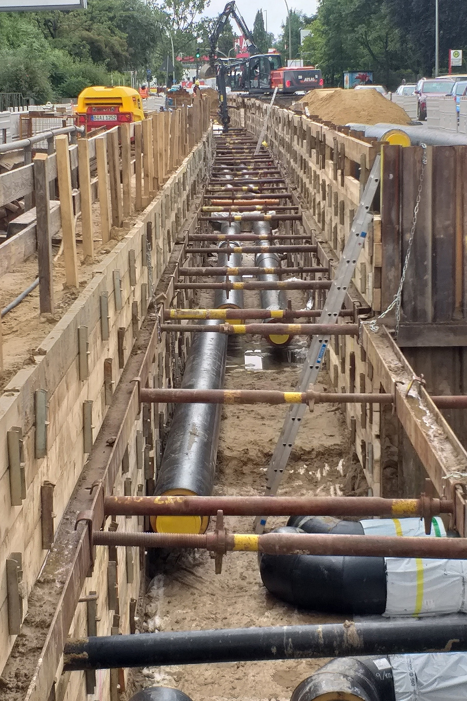 Für die Baugrubensicherung in Winkelbereichen hat thyssenkrupp Infrastructure den sogenannten krings randgestützten Eckverbau entwickelt. Das strebenfreie Verbausystem ist vor Ort flexibel einsetzbar und eignet sich hervorragend, um Richtungsänderungen im verbauten Rohrgraben bis zu 90 Grad herzustellen. Zudem trägt beim Rückbau der Ablauf von gleichzeitigem Ziehen und Verdichten zur Sicherheit im Leitungsgraben bei und verhindert Setzungen im Baufeld.