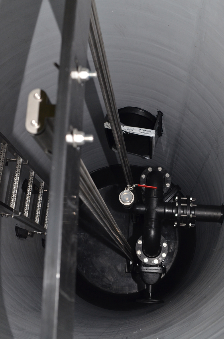 Mit obenliegender Betonabdeckung hat der Schacht eine Länge von insgesamt 4,8 m. Im Inneren befinden sich eine fest installierte Leiter und hochwertige Gleitrohre aus Edelstahl zur Aufnahme der dafür konzipierten Doppelpumpanlage. Zwei MULTIFREE Pumpen in Ex-Schutzausführung vom Typ 75/4 CW2 garantieren eine zuverlässige Abwasserentsorgung. Die zusätzlich installierte Druckrohrspülanlage BREEZE vom Typ MH3 S sorgt für kurze Aufenthaltszeiten des Abwassers in der relativ langen Druckleitung. So werden Ablagerungen und anaerobe Prozesse verhindert.