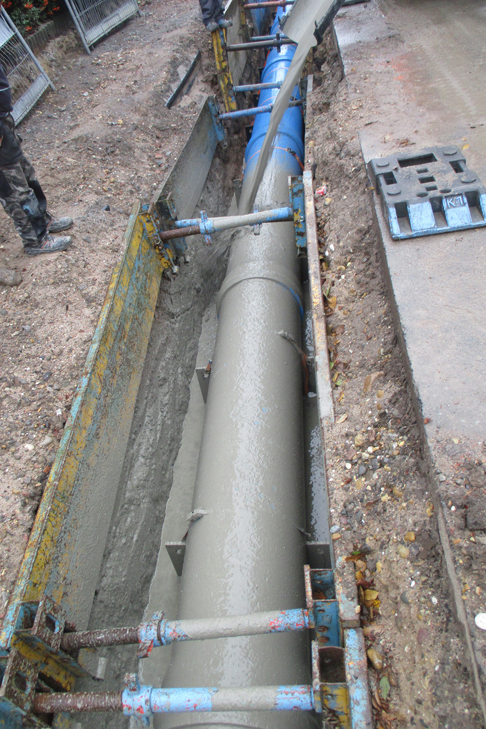 Verfüllt wurde der Leitungsgraben mit selbstverdichtendem Flüssigboden, was angesichts der reduzierten Grabenbreite zahlreiche Vorteile mit sich brachte: „Der Boden musste nicht verdichtet werden, was aufgrund der engen Platzverhältnisse auch kaum möglich gewesen wäre“, erklärt Jan Thomas von der IFK Ingenieure Partnerschaftsgesellschaft mbB aus Mosbach.
