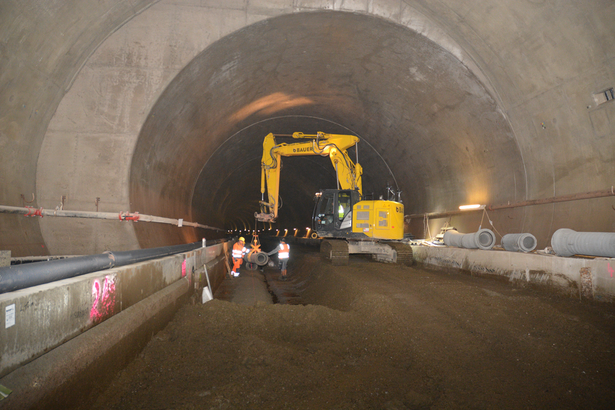 Ein wichtiger Aspekt nach Fertigstellung der Tunnelröhren und vor Ausbau der Fahrbahnen war die Tunnellängsentwässerung. Bauleiter Robert Greßler von der Bauer Bauunternehmung GmbH aus Walschleben schildert die Situation: