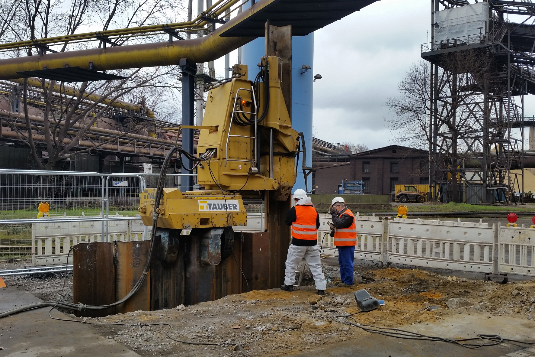 „Nach Starkregen mussten auch schon mal bis zu 2500 m3 Wasser pro Stunde bewältigt werden“, erinnert sich Bernhard Wilke. Zur Verlegung der Rohre wurde im Sanierungsabschnitt zusätzlich eine „Einziehgrube“ angelegt. In diese Baugrube sind dann durch einen Bagger die GFK-Eiprofile zum Einbau abgesenkt worden. Die Kurzrohrprofile wurden dann von hier aus in zwei Richtungen bis an die Endpunkte der Sanierungsstrecke eingebracht. Die Arbeit erledigte eine eigens von Tauber entwickelte Verlegemaschine.