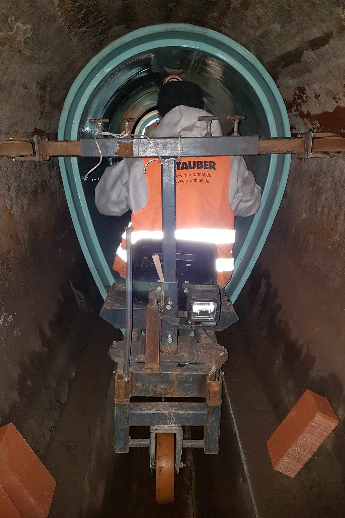 Das bemannte Rohrshuttle nimmt das Rohr auf und fährt es bis ans Ende des bereits verlegten Relining-Strangs, wo es mit Hilfe einer Steckmuffenverbindung angekoppelt wird. „Bei freier Fahrt konnten auf diese Weise täglich bis zu 10 Rohre eingebaut werden“, so Rolf. Abschließend ist der verbleibende Hohlraum zwischen den neuen GFK-Rohren und dem altem Betonprofil fachgerecht verdämmt worden.