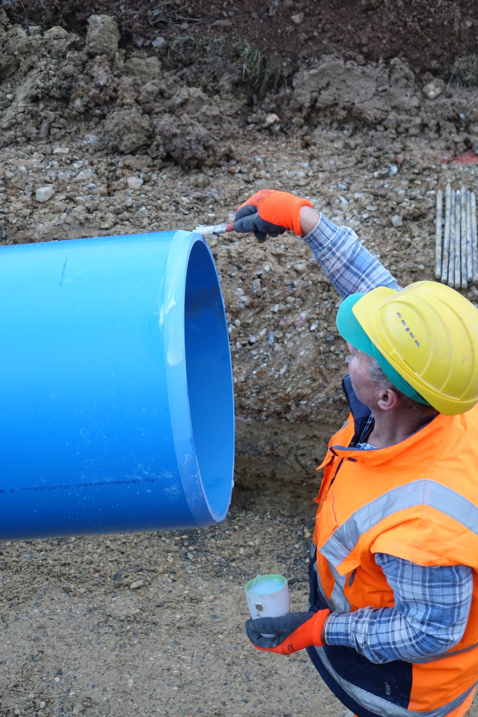 Die blauen Rohre des HS®-Kanalrohrsystems von Funke konnten vor Ort mit ihren Werkstoffeigenschaften punkten. Laut Schachtmeister Stremmel ließen sich die Rohre aus PVC-U an der Einbaustelle leicht handhaben und gut verarbeiten.