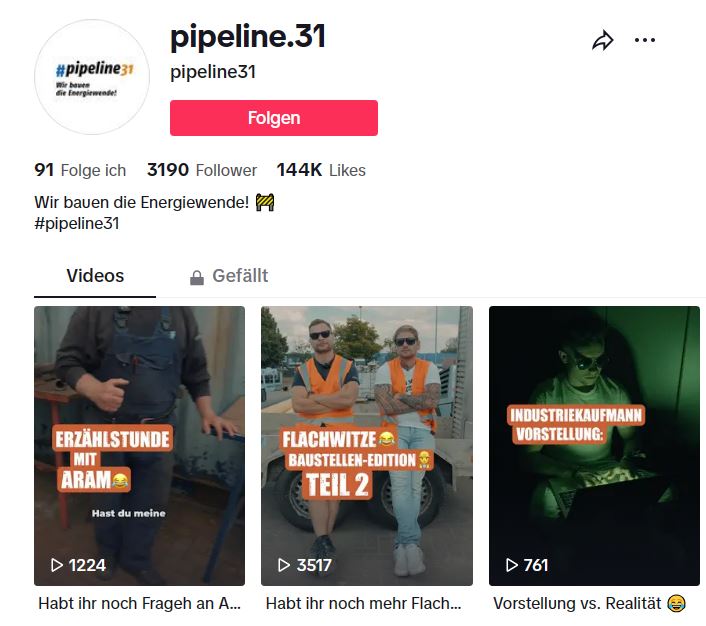 Nur circa 30 Sekunden lang sind ihre Videoclips, die – zu - meist mit einem charmanten Augenzwinkern – Einblick in die stets interessante und sinnvolle Arbeit der Branche geben. Hier erfahren Follower und interessierte TikTok-User, was ein Rohrleitungsbauer verdient, was man auf der Baustelle besser nicht sagt und wie eine Schweiß naht gesetzt oder eine Grund wasserabsenkung installiert wird und einiges mehr. „Die Views und Likes sprechen eine genauso deutliche Sprache, wie die ständig wachsende Zahl der Follower“, freut sich Dipl.-Ing. Mario Jahn, Bildungsexperte beim rbv. „Hier ist ab - lesbar, dass wir einen sehr guten Weg eingeschlagen haben, um gerade der sogenannten Ge neration Z durchaus humorvoll zu zeigen, wie interessant und vor allem sinnvoll die Arbeit unserer Branche ist“.