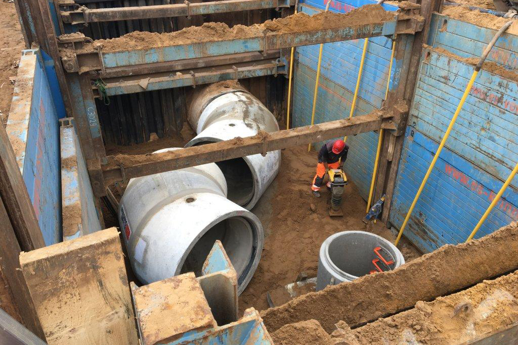 „Um Straßeneinbrüche zu vermeiden, war diese Baumaßnahme dringend notwendig“, betont Dipl.-Ing. Michael Lanius, Projektleiter der SE|BS. Bei der Umsetzung standen die Beteiligten gleich vor mehreren Herausforderungen: Im Bereich der Baugrube steht das Grundwasser bei ca. 5 Metern Tiefe, was bedeutet, dass der Schmutzwasserkanal im gesamten Abschnitt unterhalb des Grundwasserspiegels liegt. Für die Baumaßnahme war es daher notwendig, den Grundwasserspiegel während der einzelnen Bauabschnitte entsprechend abzusenken.