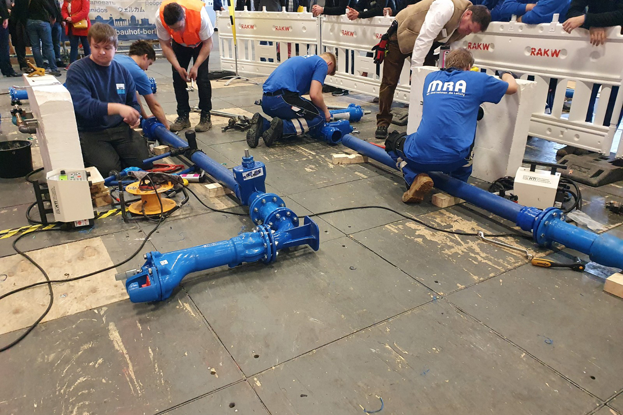 Aufgabe war die fachgerechte Herstellung einer simulierten Trinkwasserleitung DN 100/80. Dabei musste jeder Handgriff der Rohrleitungsbau-Azubis sitzen. Eine Herausforderung, die mit Begeisterung angenommen wurde. Stolzer Gewinner der Challenge war ein vom Lehrbauhof Berlin zusammengestelltes Azubi-Team der Bleck & Söhne Hoch- und Tiefbau GmbH & Co. KG, Berlin, (Azubi: Abdulghadir Alizahi), der Karl Weiss GmbH Ingenieurtief- und Rohrleitungsbau, Zeesen, (Azubi: Fatih Aldemir) sowie der Otto Wöltinger Tief- und Rohrleitungsbau GmbH & Co. KG, Berlin (Azubi: Eric Troitsch).