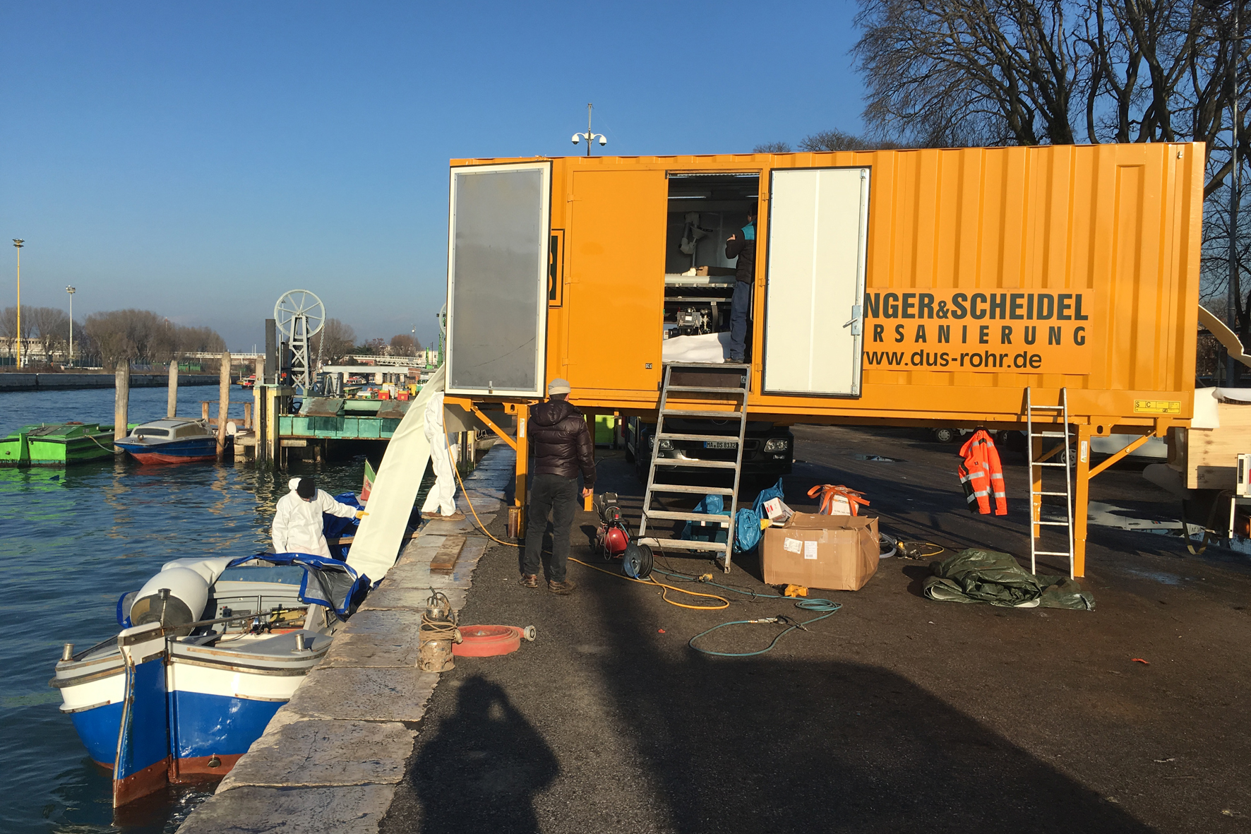 So wurde etwa die mobile Tränkungsanlage an einer Kaimauer im Hafen des Netzbetreibers außerhalb des Stadtzentrums installiert, von der aus die Einbaustelle über den Canal Grande per Boot erreicht werden konnte. Die für den Einbau und die Aushärtung erforderliche Inversionstrommel mit Dampferzeuger hingegen wurde auf einem Ponton direkt neben der Einbaustelle positioniert.