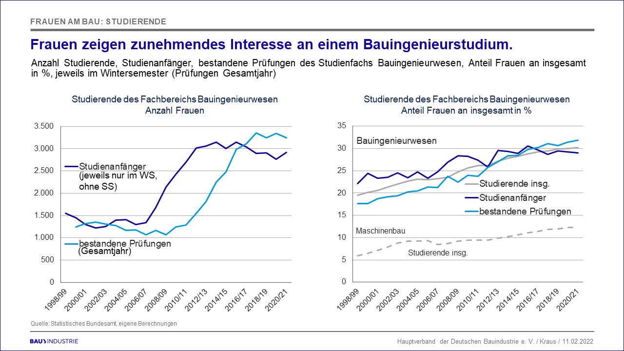 Die Frauenquote bei Studierenden eines Bauingenieurstudiums hat sich innerhalb von zwei Jahrzehnten von 20 auf 30 % erhöht. Zudem sind mittlerweile 28 % der in Bauunternehmen beschäftigten Bauingenieure weiblich.
