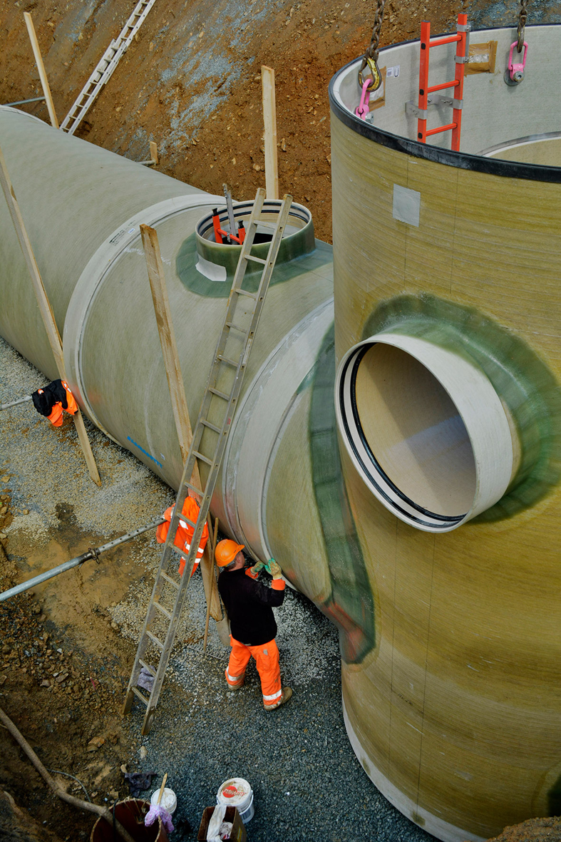 - dem eigentlichen Stauraumspeicher aus großvolumigen GFK-Rohren (bis DN 3000)