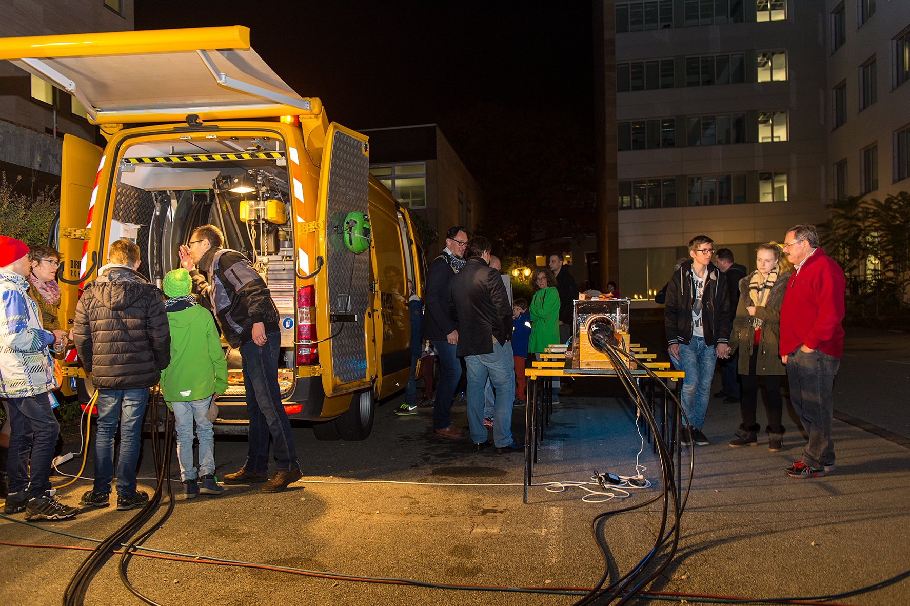 Zu Demonstrationszwecken hatten die Spezialisten der D&S Rohrsanierung außerdem eigens einen kurzen KG-Rohrstrang als Teststrecke aufgebaut, den junge und alte Besucher unter Anleitung mit einem Fräsroboter befahren konnten – eine Aktion, die offensichtlich gut ankam, denn zwischen Beginn der „Langen Nacht“ um 18.00 Uhr und Ende um 1.00 Uhr am nächsten Tag waren die Fahrzeuge permanent von Technikbegeisterten umlagert.