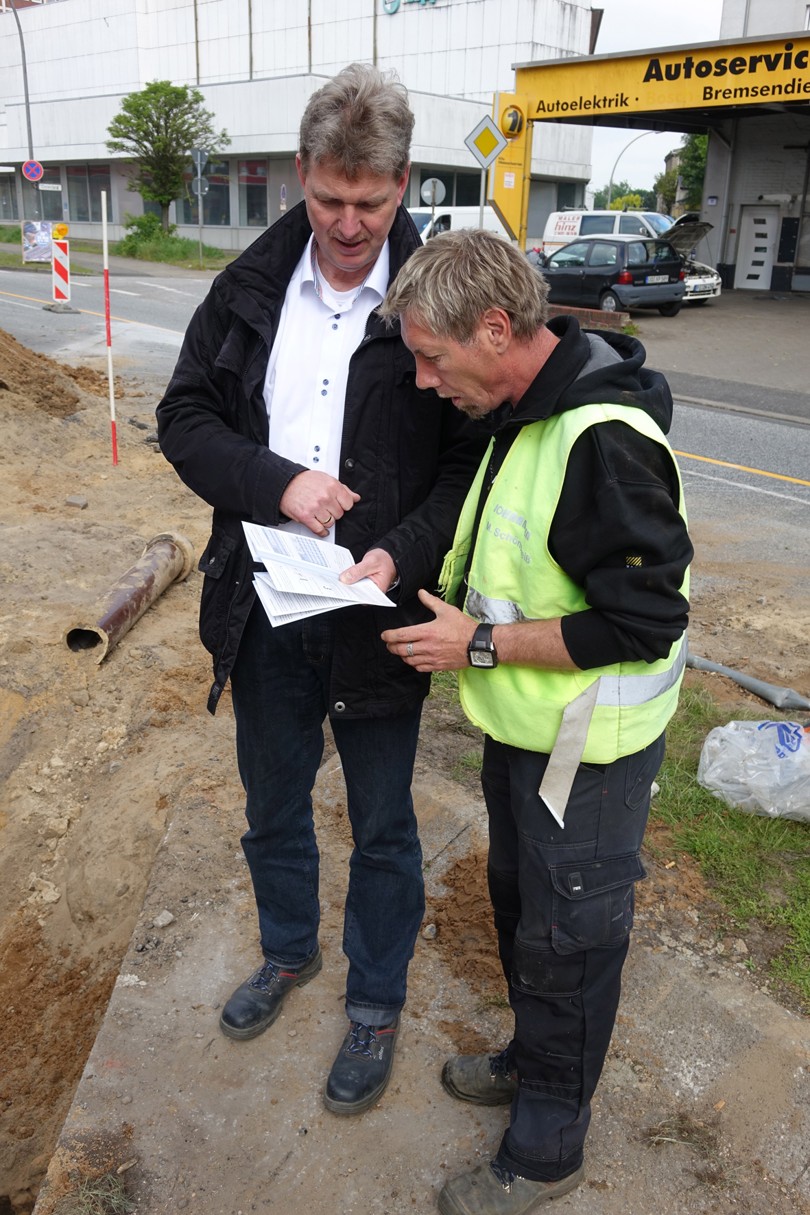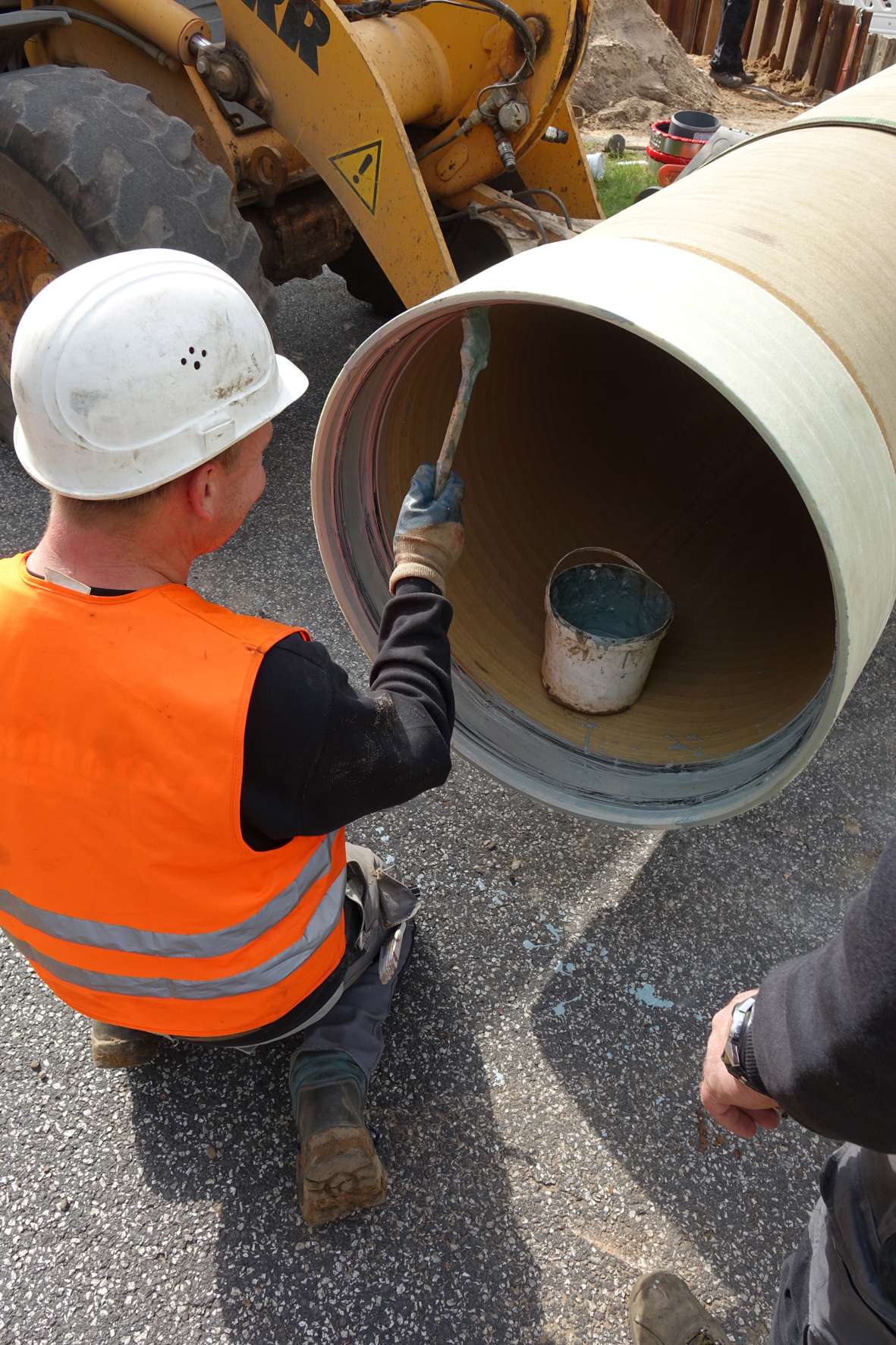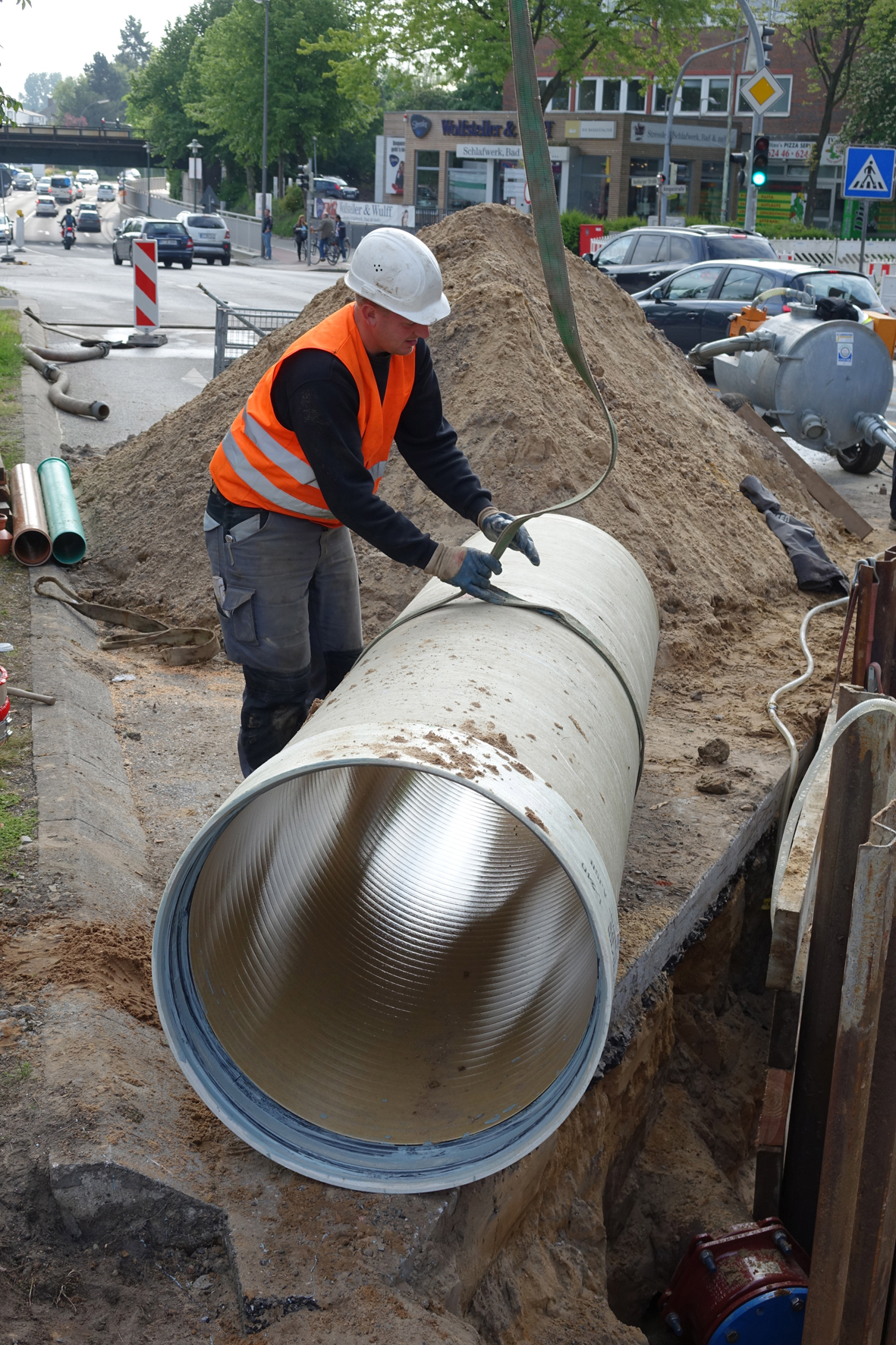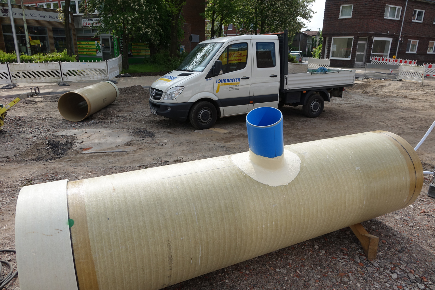 Als gute Wahl für die Elmshorner Baustelle empfahlen sich die GFK-Rohre aber nicht zuletzt aufgrund ihrer geringen Wandstärke. "Die Gasleitung der Schleswig-Holstein Netz AG liegt in ca. 1,20 m Tiefe, die Sohle der Kanalisation zwischen 2,30 und 2,40 m", führt Schachtmeister Schöneweiß aus. "Im Klartext bedeutet das: Zwischen Gasleitung und Regenwassersammler blieb ein Abstand von gerade einmal 10-20 cm."