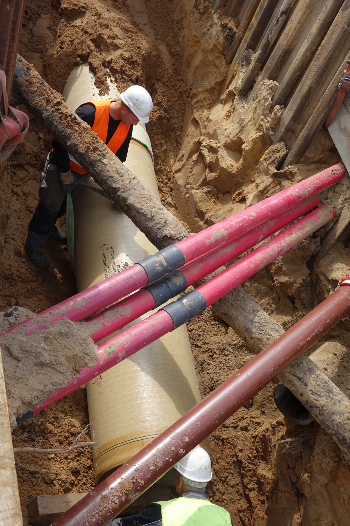 Mit Blick auf diese Rahmenbedingungen entschieden sich die Ingenieure der Stadtentwässerung für FLOWTITE GFK-Rohre DN 800. Maßgeblich für die Entscheidung war neben den guten hydraulischen Eigenschaften und problemlosem Handling auf der Baustelle vor allem die geringe Wandstärke der Rohre, die entscheidend dazu beitrug, dass die Verlegung des neuen Regenwassersammlers durch das Nadelöhr unter der Gasleitung reibungslos vonstatten ging.
