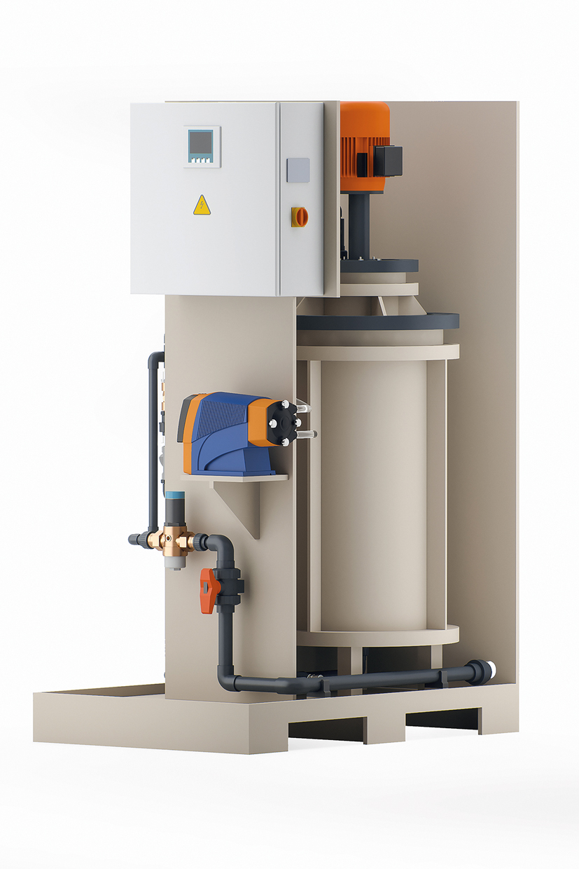 Abhängig vom zulässigen Gegendruck ist das Dosiersystem wahlweise mit einer Schlauch-, Magnet- oder Motor-Dosierpumpe ausgestattet. Diese dosiert das Flüssigpolymer in eine spezielle Mischkammer, in der durch das optimale Vermischen mit Wasser eine ausgereifte und vollständig aktivierte Polymerlösung mit einer Reifezeit von 15min entsteht. Dank des kompakten Designs spart das Dosiersystem Platz am Installationsort und bietet verschiedene Aufstellmöglichkeiten.