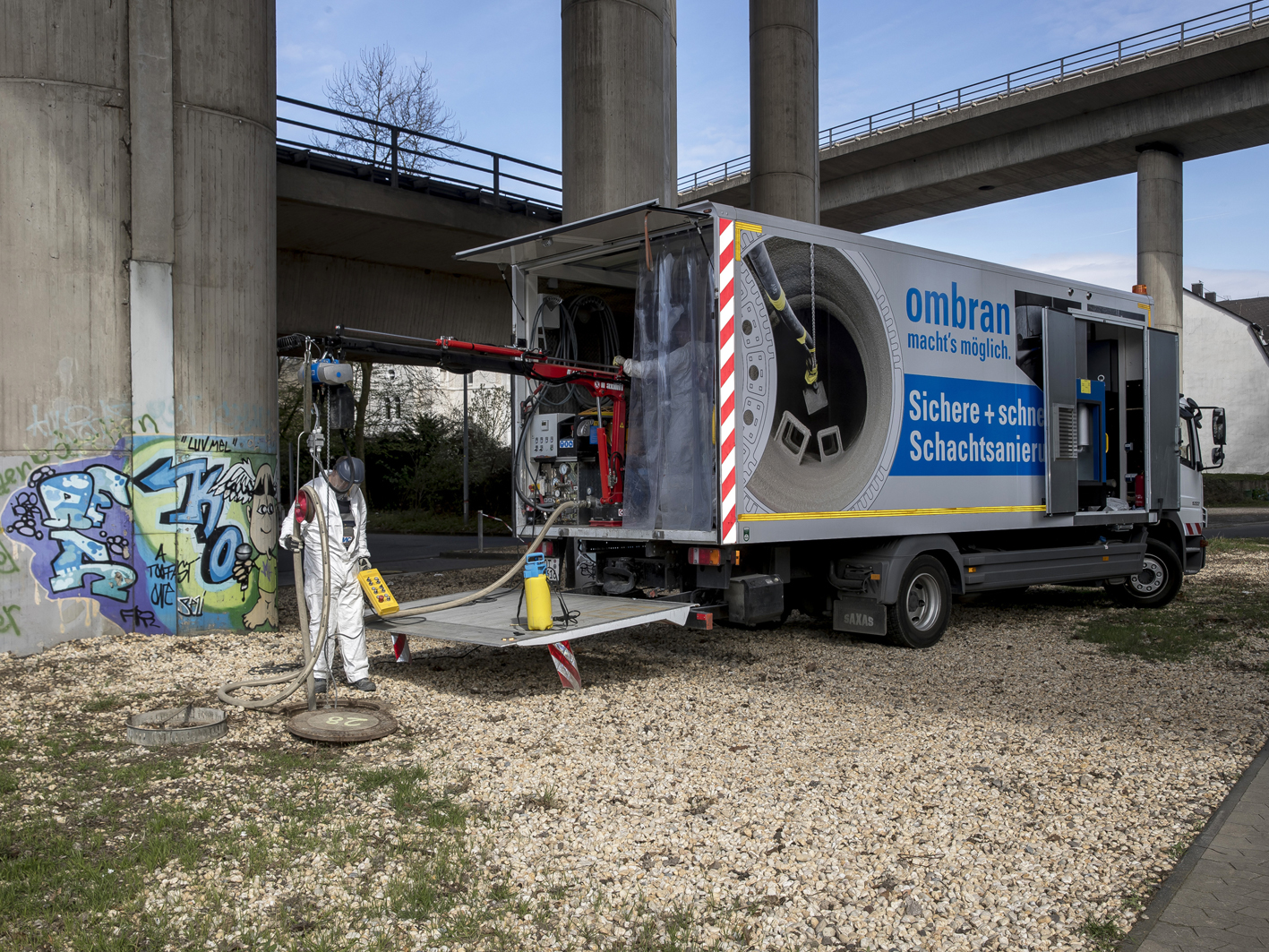 Wie überlegen der Einsatz des Trucks gegenüber einer manuellen Sanierung der Schachtinnenwände sein kann, zeigte im Frühjahr 2017 ein Auftrag in Rheinland-Pfalz. Dabei wurden in einem Projekt der Verarbeitungsfirma BauOlymp in vier Tagen 40 Schächte eines Regenwasserkanals mit Schachttiefen zwischen einem Meter und sechs Metern wie am Fließband neu beschichtet. Dieses rekordverdächtige Tempo bei der Ausführung konnte nicht zuletzt deswegen erzielt werden, weil die Schachtinnenwände bereits im Vorfeld für die anstehende Neubeschichtung präpariert worden waren.