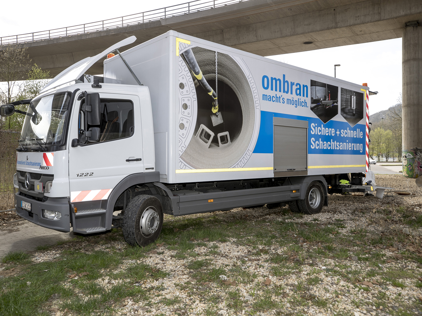 Zusammen mit ihrem Tochterunternehmen HDT GmbH hat MC ein MRT-System quasi auf Räder gesetzt und es dabei gleich für den mobilen Einsatz optimiert. Das Ergebnis ist der MRT-Truck, ein höchst flexibles und autarkes Einsatzfahrzeug, bei dem alle erforderlichen Gerätschaften und Komponenten zur automatisierten Schachtsanierung von der Untergrundvorbereitung bis zur Beschichtung in einem Truck fest verbaut sind. Der 12-Tonner, dessen Bedienung durch einen erfahrenen MRT-Operator unterstützt wird, verfügt über eine autarke Strom-, Wasser- und Druckluftversorgung, einen Mörtelmischer, eine Mörtelpumpe sowie ein komplettes MRT-Equipment.