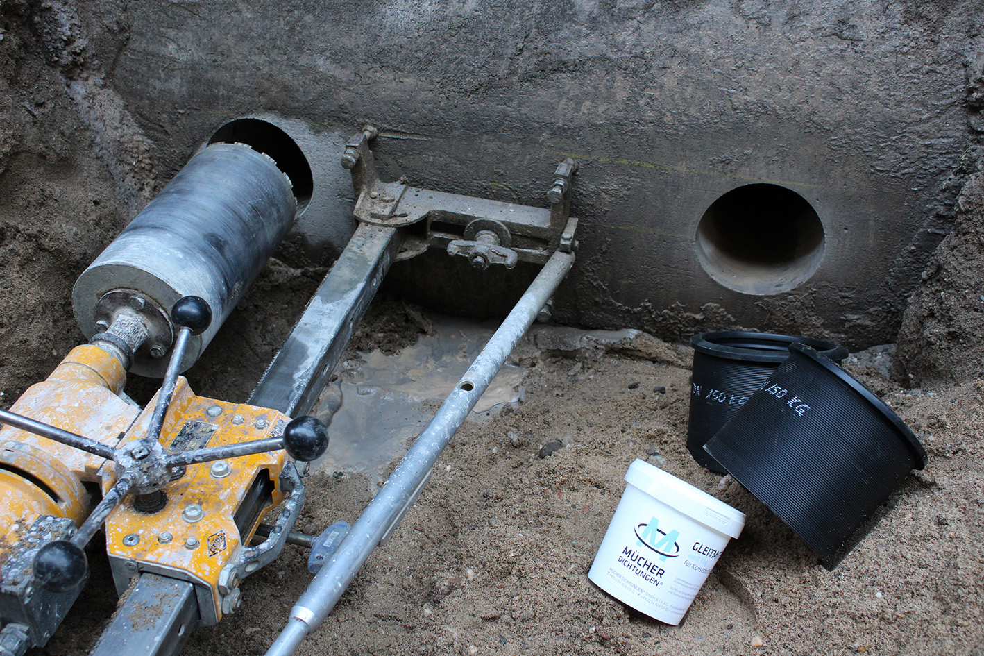 Anschließend wurde Mücher Gleitmittel auf die Innenseite der M140 und das Spitzende des Anschlussrohres DN 160 aufgetragen und dieses in die Ringraumdichtung eingeschoben. So konnten die acht neuen Anschlüsse schnell und vor allem dicht unter Einhaltung der zu beachtenden Vorgaben hergestellt werden.