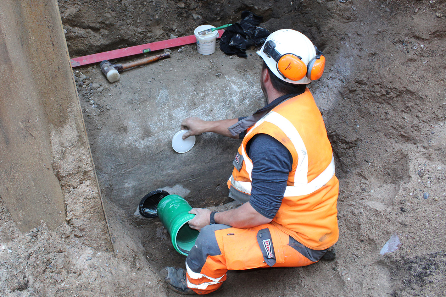 Bauleiter Krämer hat insbesondere der schnelle und einfache Einbau überzeugt. Das Schwierigste sei die Kernbohrung für die neuen Anschlüsse gewesen, so Krämer. Aber diese konnte von STRABAG mit eigenem Gerät und passender Bohrkrone problemlos in den Steinzeug-Stahlbeton-Verbundrohren hergestellt werden. Nach Reinigung des Bohrloches wurde die Ringraumdichtung passgenau bis zum Anschlag eingesetzt.