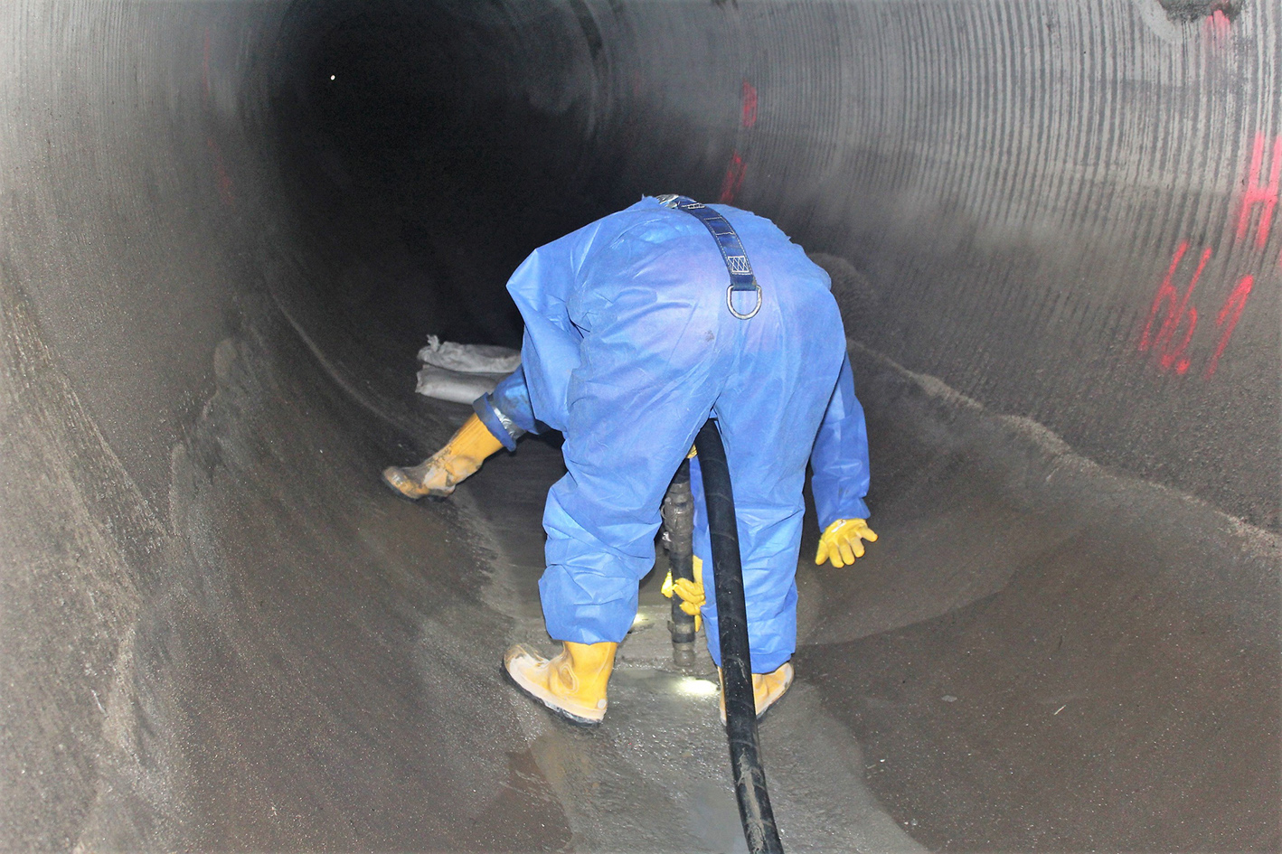Während eine Aarsleff-Kolonne die Amiblu Rohre in den Regenwassersammler einbaute, sanierte parallel ein zweiter Trupp an anderer Stelle den Sammler mit Hilfe der ombran-Beschichtungsysteme der MC-Bauchemie.