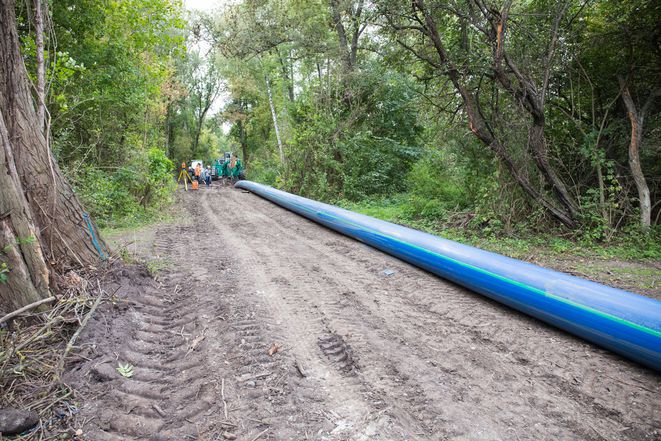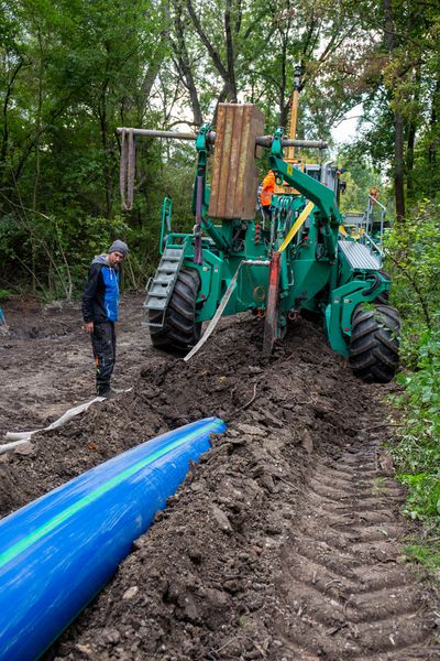 Besonders herausfordernd war ein rund 2 km langer Abschnitt, der durch ein Schutzgebiet mit hohem Grundwasserpegel verläuft. Bei diesem sensiblen Projektabschnitt entschied man sich für das sogenannte „Pflugverfahren“ zur Installation des da 560 mm SDR 17 Rohres. Diese bodenschonende Verlegetechnik verhindert die Verdichtung des Erdreichs und die Durchmischung der verschiedenen Sedimentschichten.