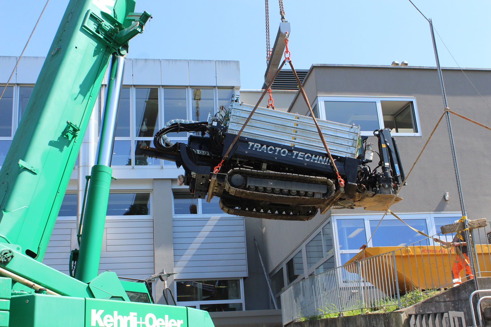Die 70 m lange Bohrtrasse auf dem dicht bebauten Klinikgelände verlief entlang der Spitalkappelle in einen Lüftungsraum im Keller des INO. Wegen der sehr engen Platzverhältnisse im Startbereich wurde in Absprache mit allen Beteiligten eine 2.50 m hohe Aufschüttung zwischen Gebäude und Tanklager als Startplatz der Bohranlage gewählt. Der in ca. 3 m tief gelegene Lüftungsraum musste mit einer horizontalen und vertikalen Zielgenauigkeit von +/- 20 cm erreicht werden, um Schäden an bestehenden Leitungen im Gebäude zu vermeiden. Alles in allem genau die richtige Aufgabe für das erfahrene Team der Firma Zemp.