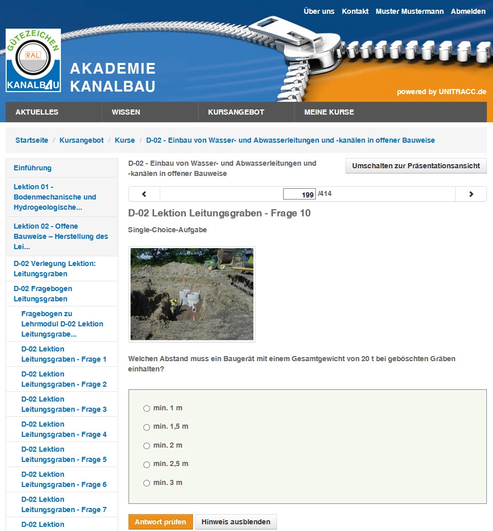 Gütezeicheninhaber der Beurteilungsgruppen „Kanalbau in offener Bauweise“ (AK) – hierzu zählen die Gruppen AK3, AK2, AK1 – sowie Gütezeicheninhaber der Beurteilungsgruppe „Ausschreibung und Bauüberwachung Kanalbaumaßnahmen in offener Bauweise“ (ABAK) erhalten im Juli diesen Jahres Zugangsdaten von der Gütegemeinschaft für die Anmeldung und Nutzung der Plattform. Nach dem Einloggen hält ein persönlicher Arbeitsbereich unterschiedliche Angebote für den Nutzer bereit. Das Arbeiten mit den verschiedenen Inhalten des E-Learning-Moduls nimmt in Abhängigkeit des Kenntnisstands des Nutzers ungefähr 30 Stunden in Anspruch.