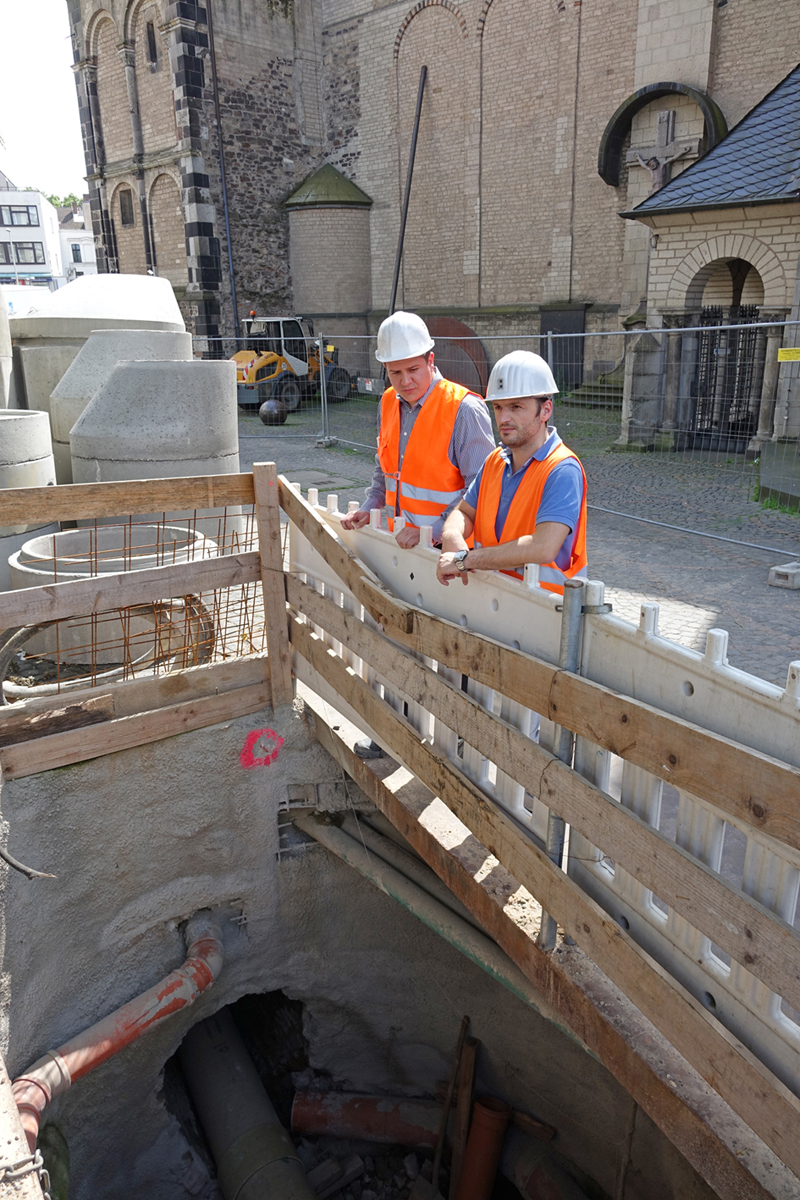 Nach dem Einbau des Rohrstranges mit sukzessiver Übernahme und Anschluss der Zuläufe wurde der Hohlraum zwischen den neuen GFK-Rohren und dem altem gemauerten Eiprofil fachgerecht verdämmt. Darüber hinaus war in diesem Abschnitt eine erste Herausforderung zu meistern: „Im Bereich des Hauptportals der Münsterkirche machte der Kanal auf einer Länge von 25 m einen U-förmigen Schlenker“, so Frömbgen, „hier bestand der Kanal aus Beton“.