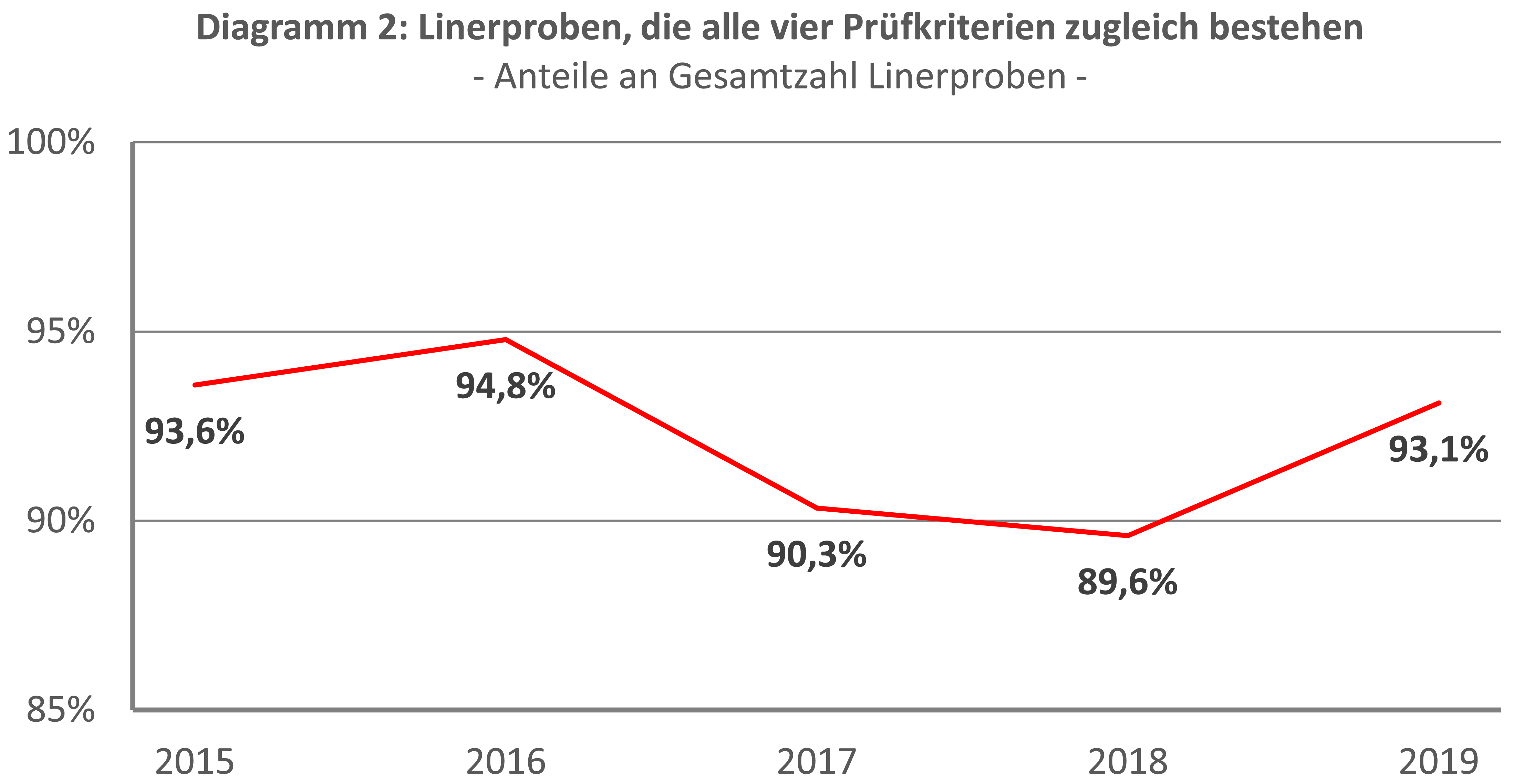 Jedes Jahr, wenn es draußen kalt ist, wird er heiß serviert: der IKT-LinerReport. Der nun zum 16. Mal kredenzte Bericht aus der IKT-Prüfstelle sieht zunächst recht appetitlich aus. Die Erfolgsquoten in den Einzelkriterien reichen nah an 100 Prozent ran. Erst wenn man alle Kriterien zusammen auf dem Teller hat, wirkt das Gericht nicht mehr ganz so stimmig. Denn immerhin sieben Prozent aller Proben bestehen mindestens eine Prüfung nicht. Jeder 14. Liner macht Bauchschmerzen!