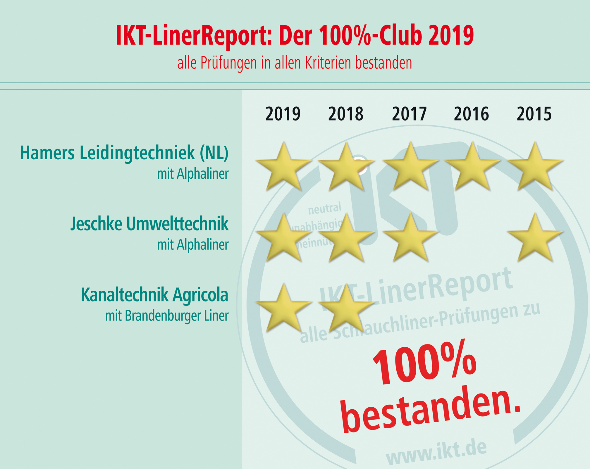 Allerdings ist auch nicht zu übersehen, dass es nur sehr wenigen Sanierungsfirmen gelingt, durchgehend eine sehr gute Leistung zu erbringen. Das sind die drei Firmen im „100%-Club“, die alle vier Prüfkriterien jeweils zu 100 Prozent bestanden haben. Bei insgesamt 23 Sanierungsfirmen, deren Baustellen-Proben in den IKT-LinerReport 2019 eingehen, ist hier zweifelsohne noch genug Luft nach oben für Qualitätsverbesserungen.