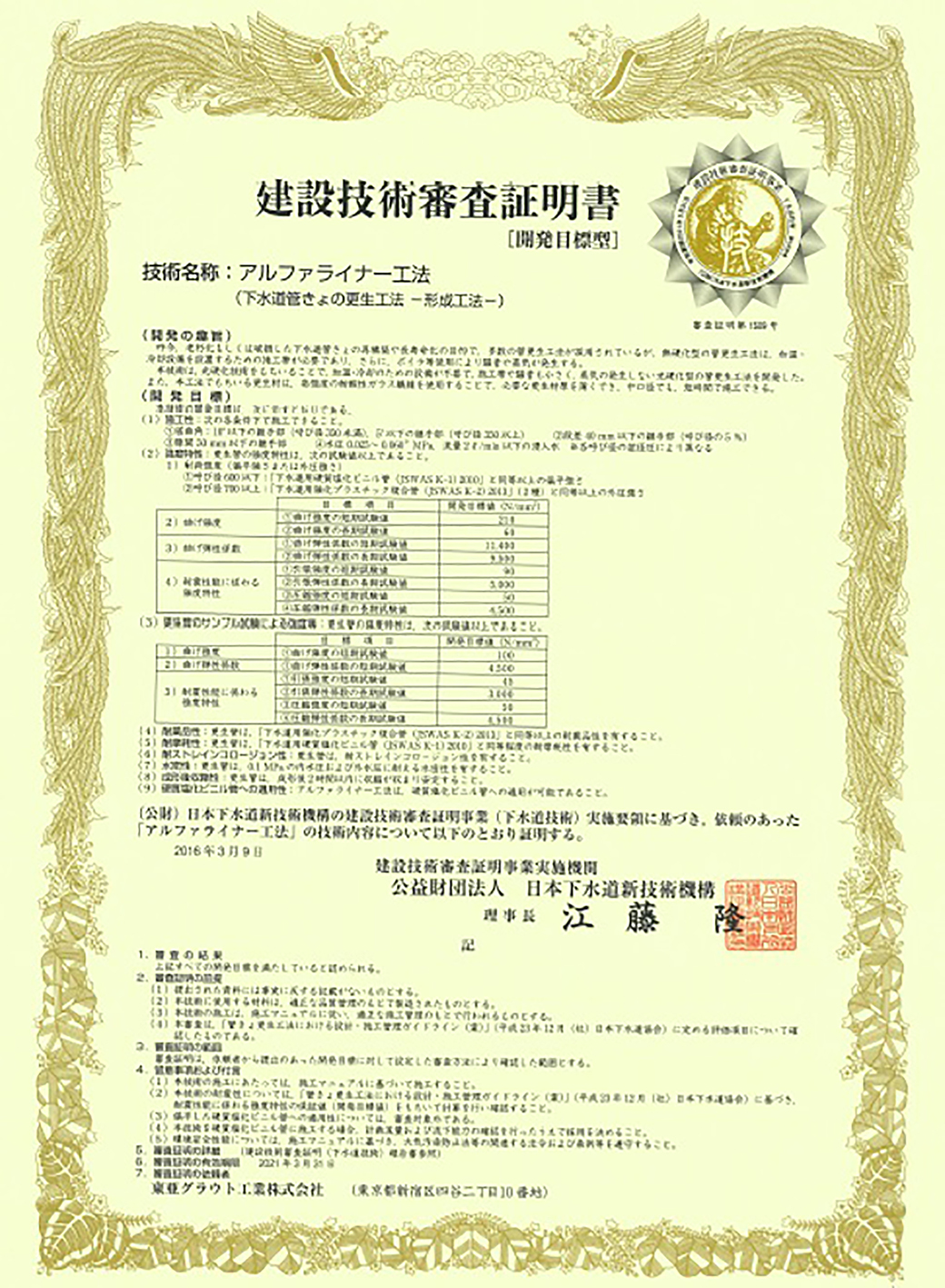 Das Alphaliner‐Verfahren ist jetzt in Japan für den Einsatz bei Kanalsanierungsprojekten mit UVlichthärtenden GFK‐Schlauchlinern für öffentliche Auftraggeber zugelassen. Im März erteilte JIWET, das Japan Institute of Wastewater Engineering Technology, nach umfangreichen Prüfungen und fast zwei Jahren Vorbereitung die offizielle Zulassung.