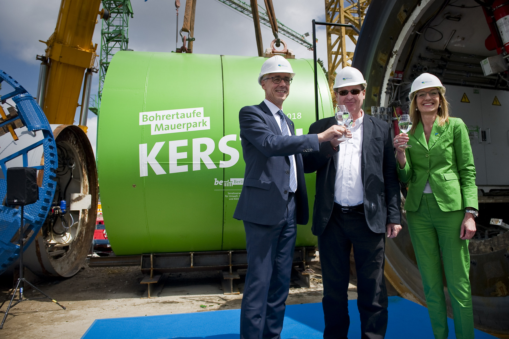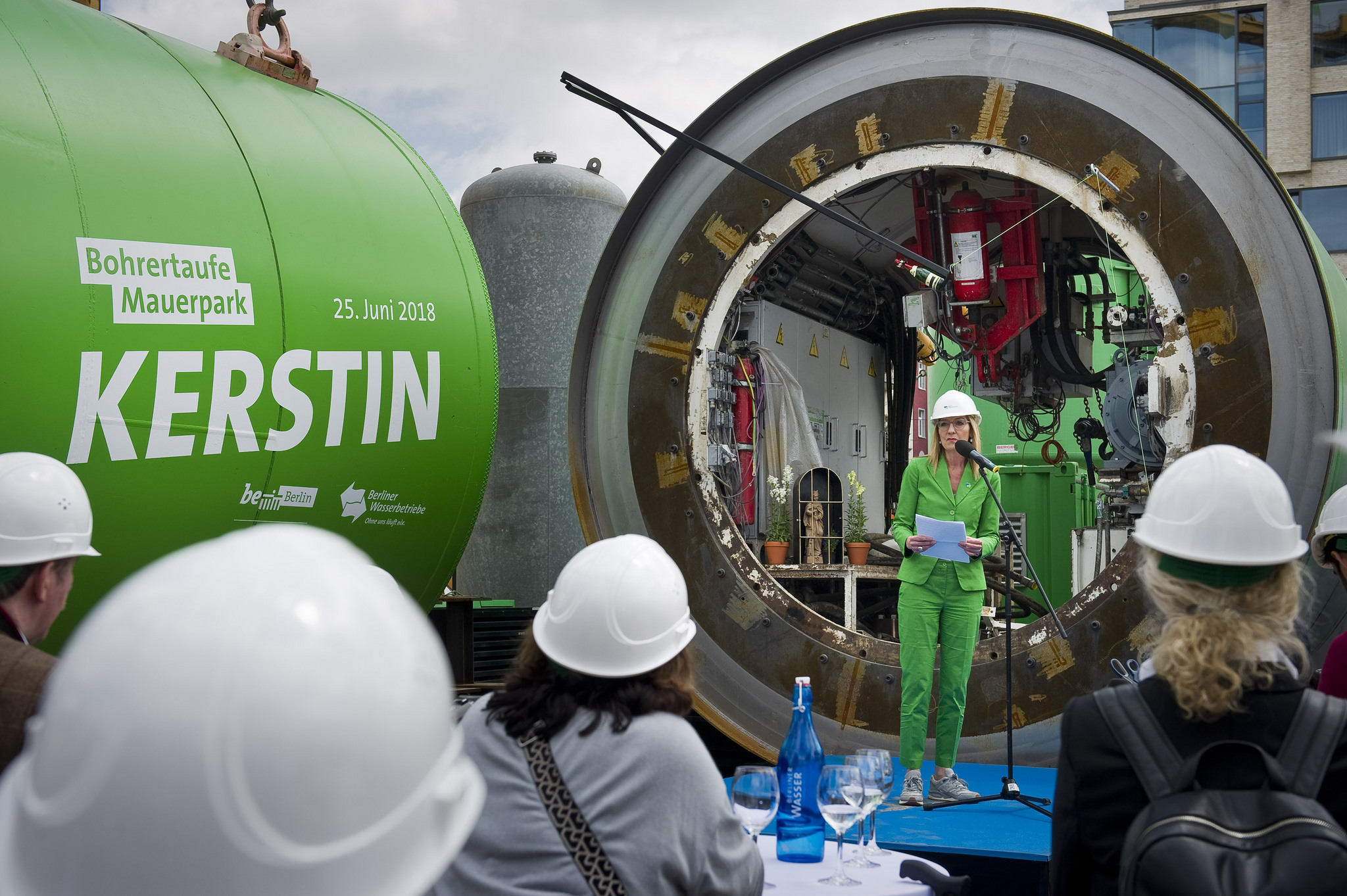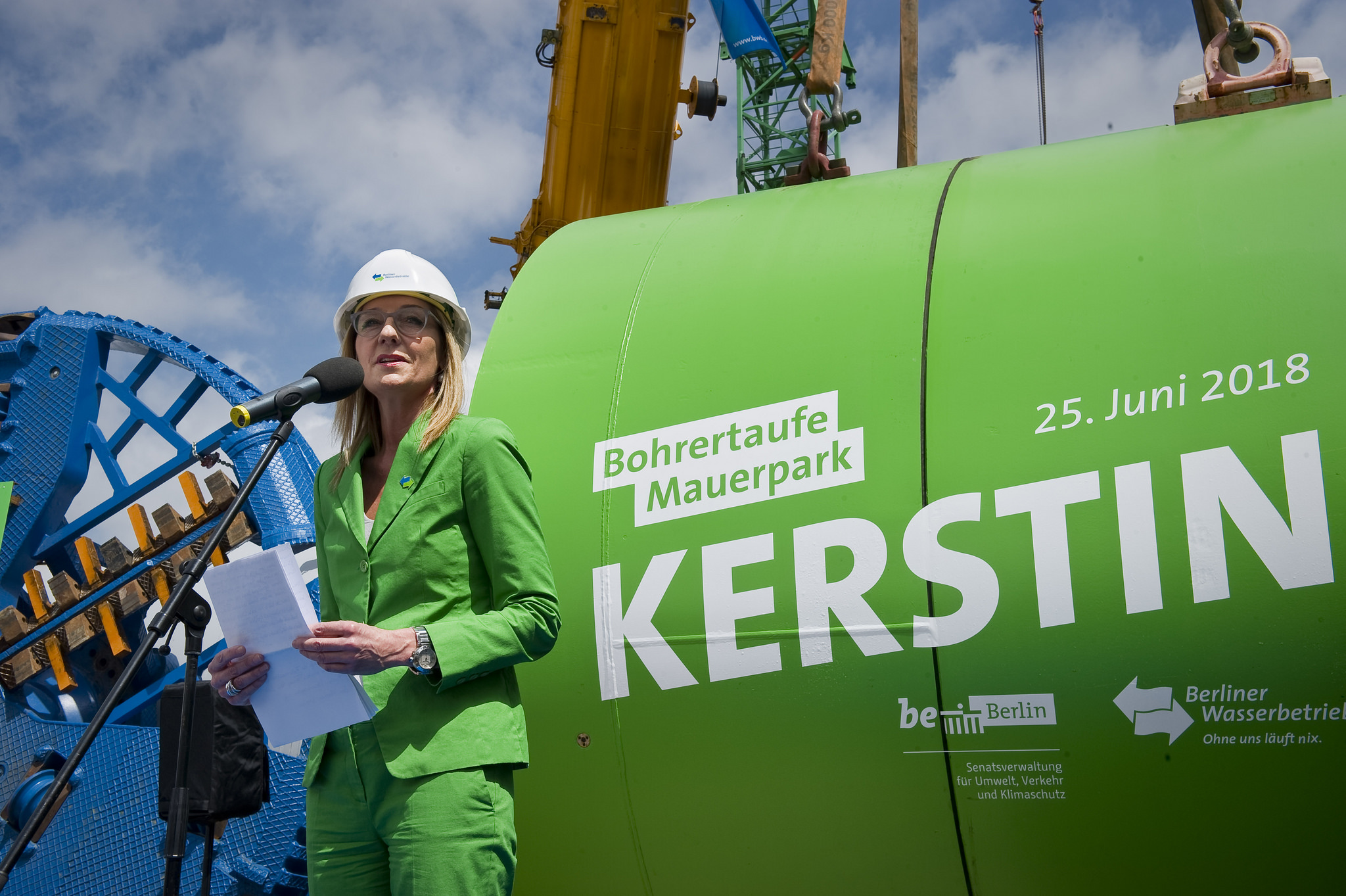 Die Tunnelbohrmaschine wurde traditionsgemäß getauft. Namenspatin ist Kerstin Oster, Personalvorständin der Wasserbetriebe, die bei der Taufe um noch mehr Frauen und Mädchen für das innovative Umweltunternehmen warb: