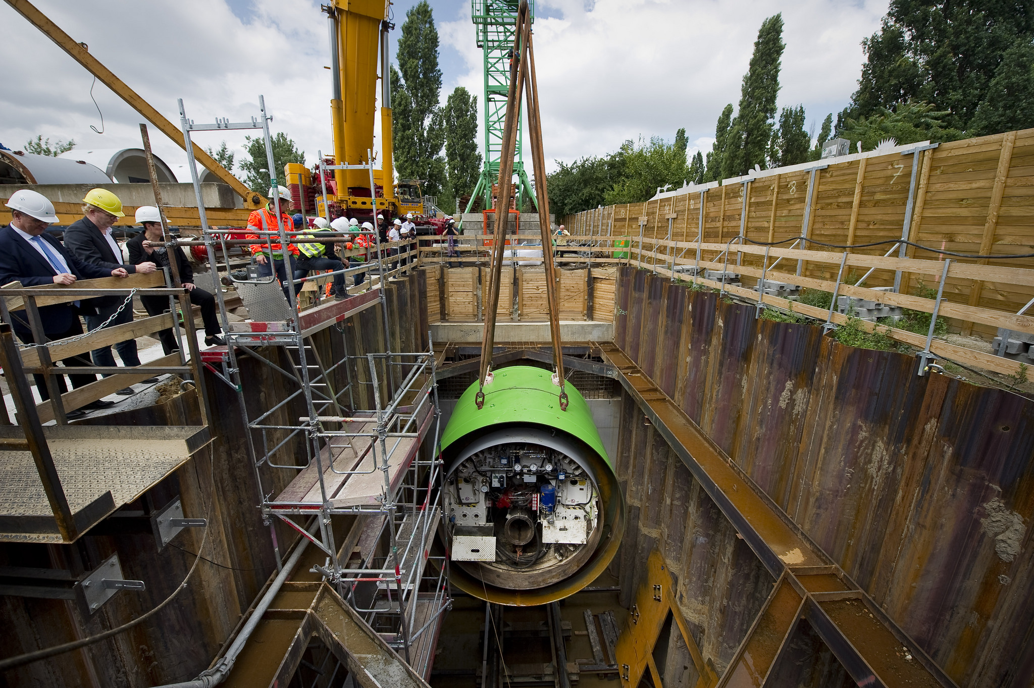 Ende Juni fällt mit der Taufe der Tunnelbohrmaschine und ihrem Einsetzen in die 13 Meter tiefe Baugrube an der Bernauer Straße der Startschuss für den Vortrieb des Stauraumkanals unter dem Mauerpark.