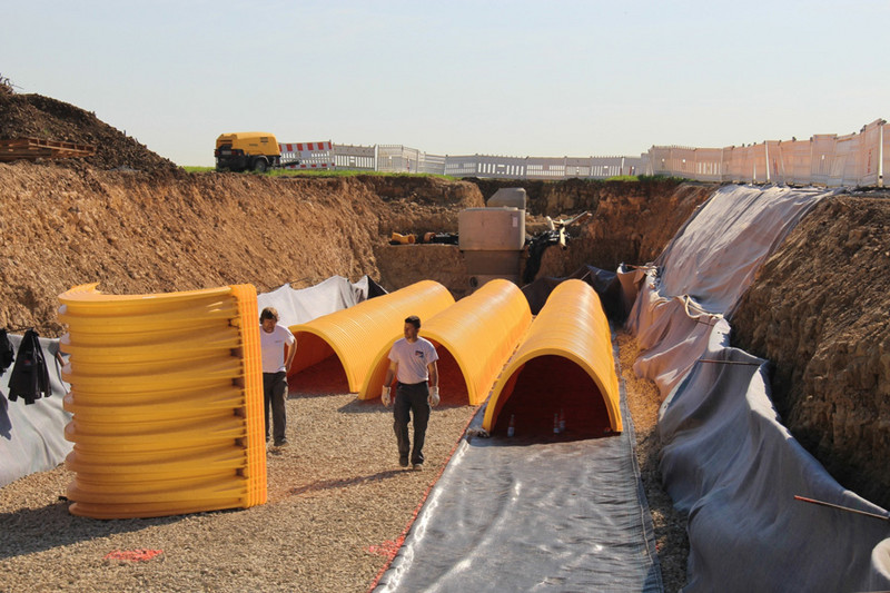 Nicht nur die Messwerte überzeugen kritische Betrachter, die praktischen Stärken liegen im Aufbau. Die Tunnel werden gestapelt geliefert, einfach ausgelegt und ineinandergesteckt − Keine Verbinder, keine Verkantung oder andere komplizierte Montagetechniken notwendig. Die BIRCO Rigolentunnel werden mittels Aufschütten von Gesteinsmaterial bis zur Belastungsklasse SLW 60 stabilisiert.