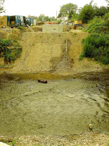 Grundsätzlich entschlossen sich die Planer, das Abwasser in zwei parallelen Rohrleitungssträngen der Nennweiten DN 500 bzw. DN 200 unter dem Fluß hindurch zu leiten. Die Zweispurigkeit eröffnet dem Betreiber die Option, den Abwasserfluß auf einen der beiden Stränge zu beschränken, so dass der andere zu Wartungszwecken zeitweilig still gelegt werden kann. Die Dükerleitungen wurden, wie bereits der gesamte neue Hauptsammler V, mit GFK-Wickelrohren des Systems FLOWTITE von Amitech Germany, Mochau, ausgeführt. Diese werden im Dükerbereich als Druckleitung ausgelegt, was unter anderem bedeutet, dass die bis zu sechs Meter langen Rohre mit zugfesten Scherstabkupplungen verbunden werden. Beim Anschluss von Bögen und Formteilen setzte man zum gleichen Zweck Flanschverbindungen ein. Die Abwasser führenden Rohre sind Ihrerseits unter der Wesenitz in einem Betonkanal DN 1600 verlegt, der darüber hinaus im Scheitel noch drei Leerrohre für Strom- und Telekommunikationskabel aufnimmt. Dieser Betonkanal wurde in offener Bauweise in zwei Bauabschnitten mit Hilfe einer Kastenspundung im Fluß verlegt.