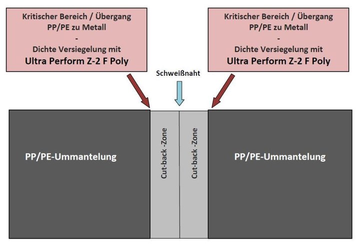 Die herkömmliche Korrosionsschutz-Methode ist die Verwendung von Epoxy-Primer und passenden Schrumpfhülsen. Effektiver ist die Anwendung vom neuen Ultra Perform Z-2 F PO, welches einen speziellen Haftvermittler enthält. Durch diesen Zusatz erreichen wir bestmögliche Haftfestigkeiten auf PE/PP-Untergründen.