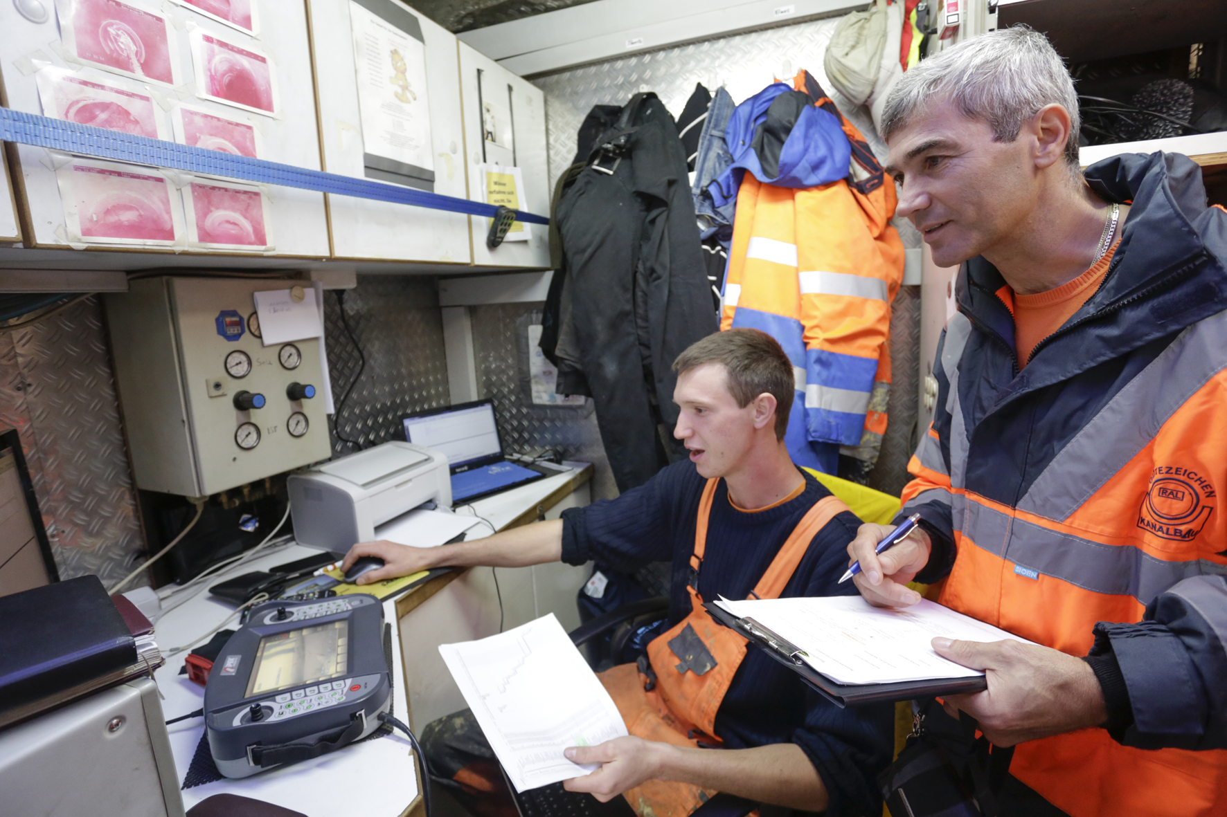 Fehlen Angaben, oder ist alles richtig und vollständig dokumentiert? Ist das Personal qualifiziert und sind auch die gemeldeten Leute auf der Baustelle? In den meisten Fällen steht der Polier dem Prüfingenieur als Ansprechpartner beim Baustellenbesuch zur Seite, legt die erforderlichen Unterlagen vor und beantwortet etwaige Fragen. Stimmt die Situation auf der Baustelle mit den gemeldeten Daten überein? Gemeinsam werfen die Fachleute einen Blick in den Rohrgraben.
